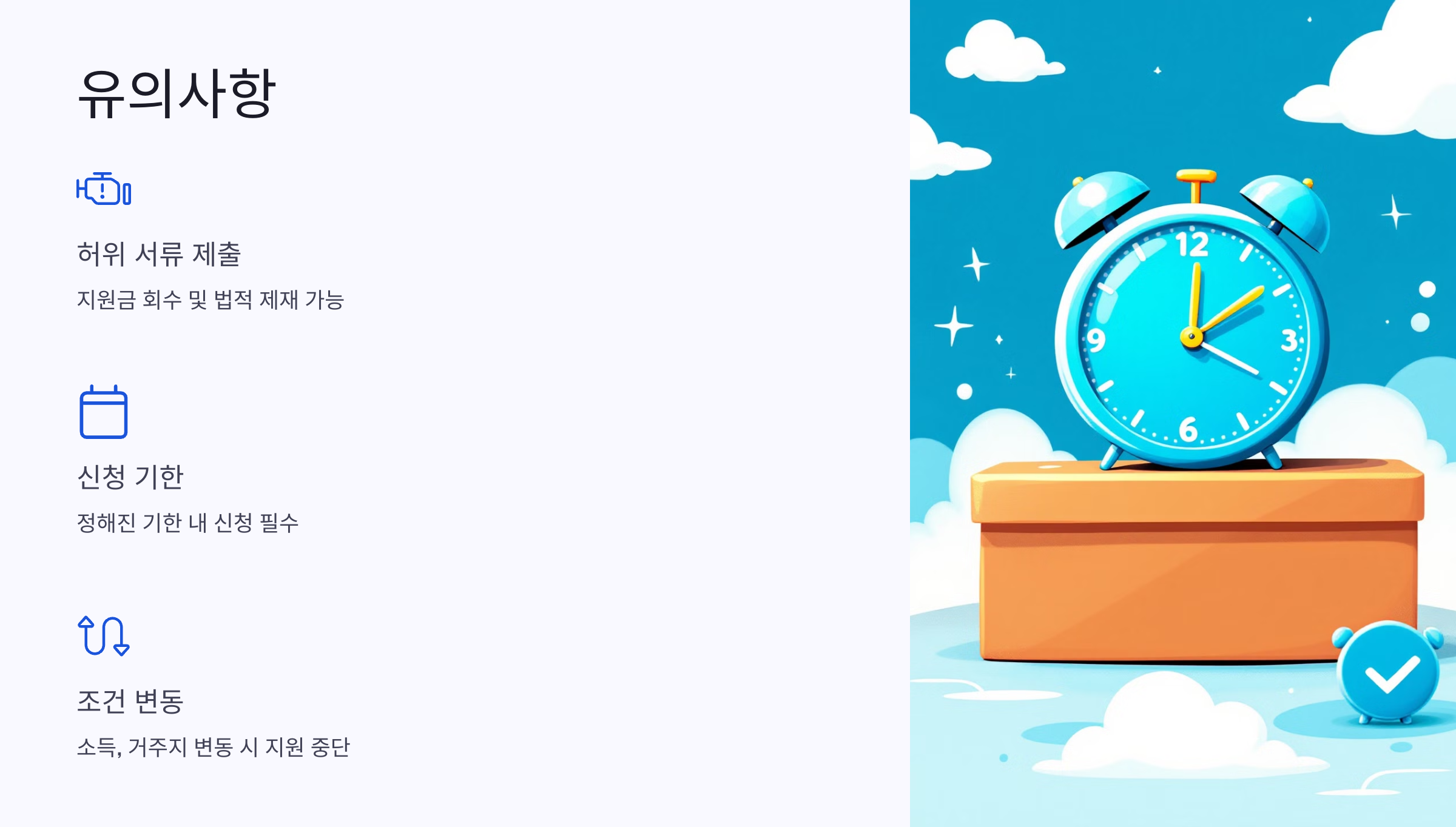 - 지원 기간 동안 조건(소득, 거주지 등)이 변동되면 지원이 중단될 수 있습니다.