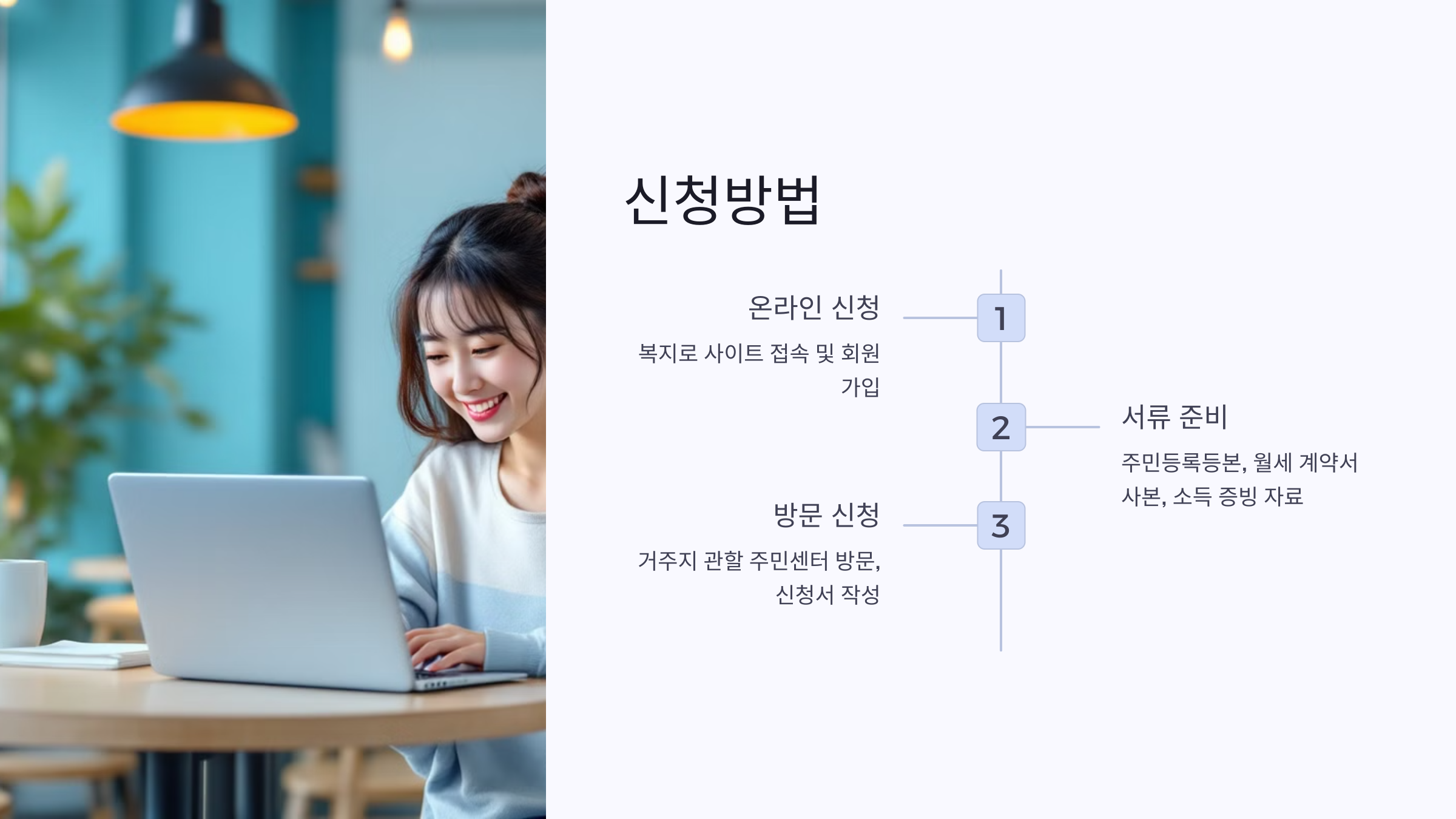 - 필수 서류: 주민등록등본, 월세 계약서 사본, 소득 증빙 자료(급여명세서, 소득확인서 등).