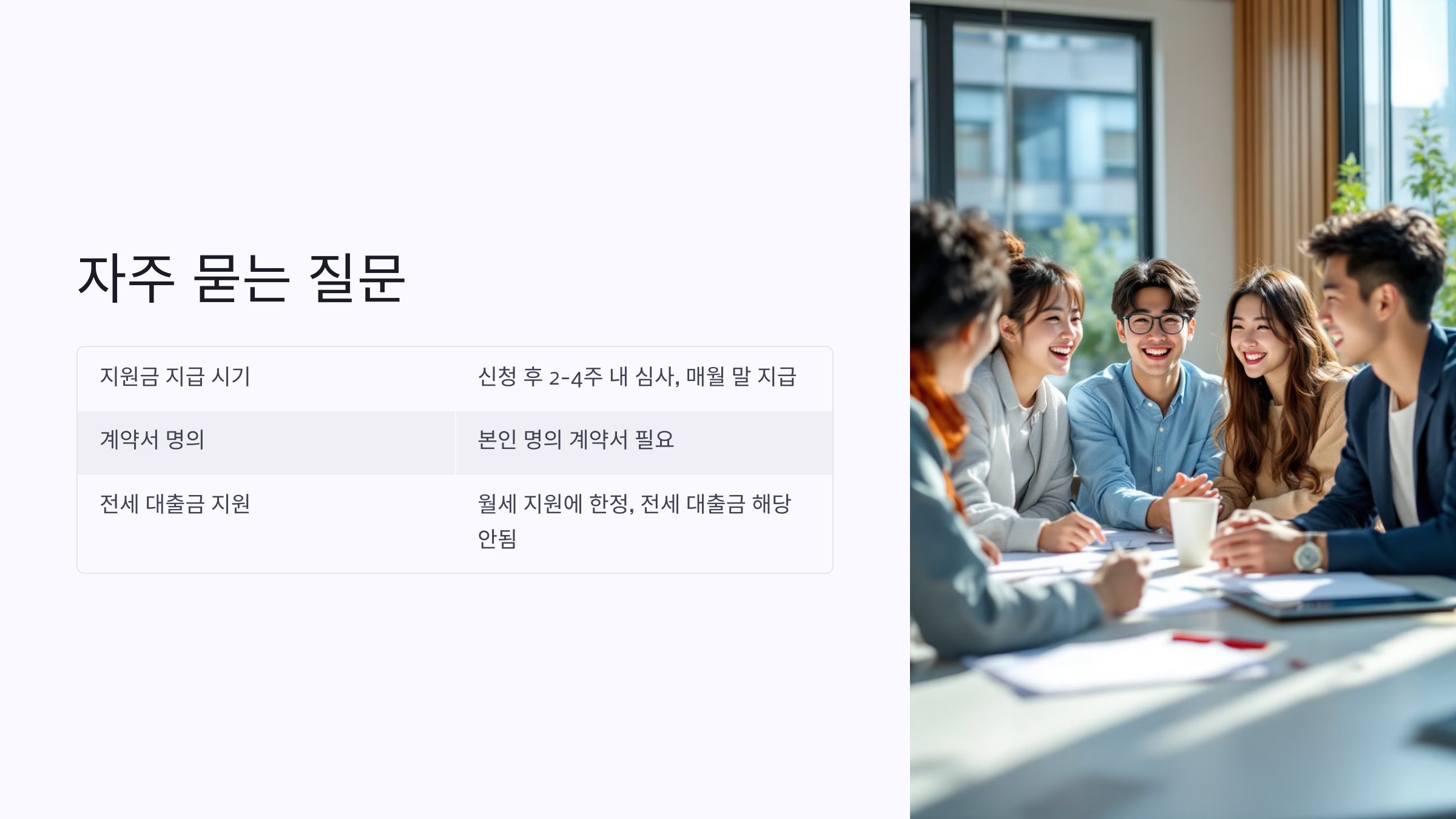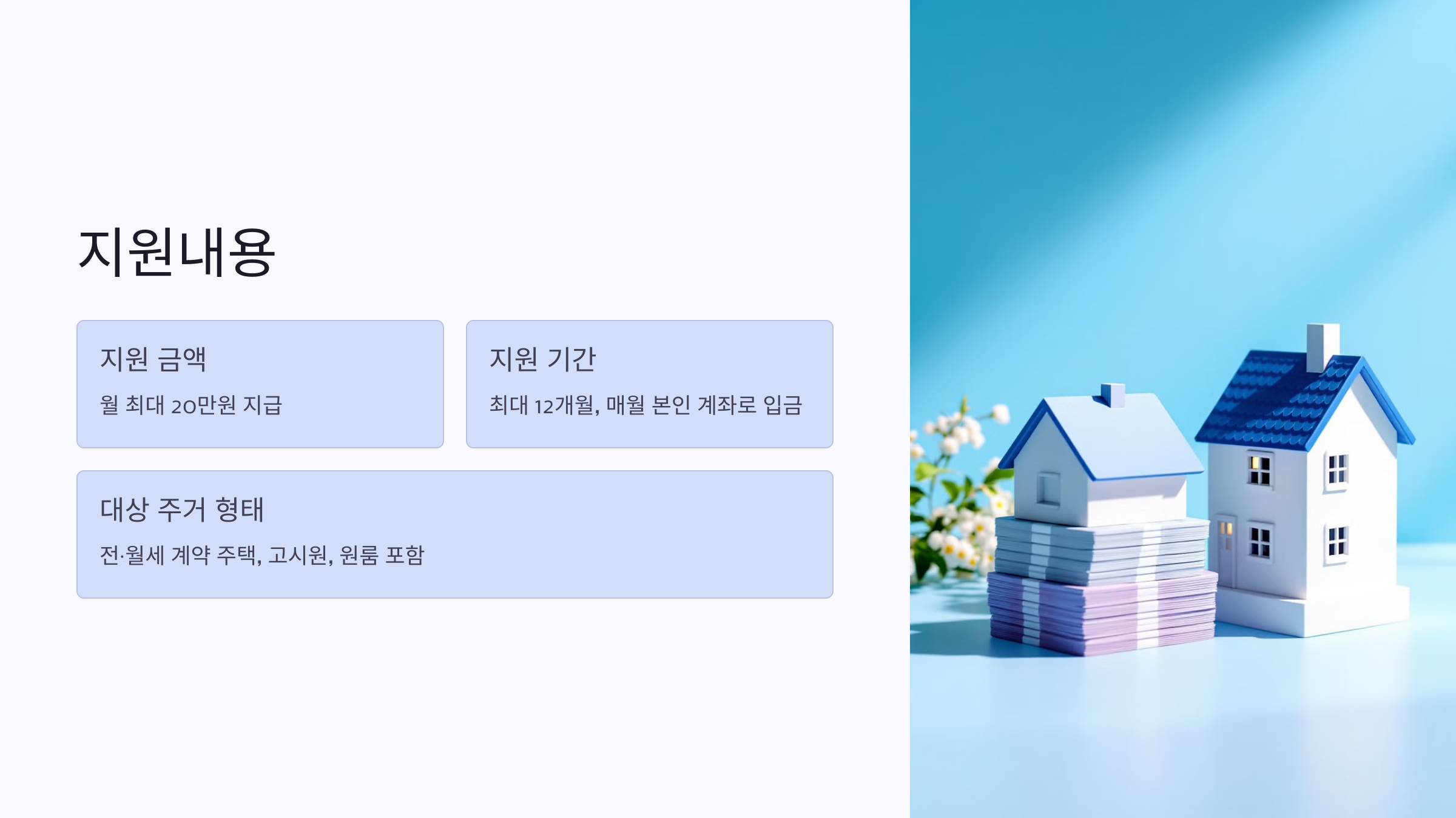 - 매월 월세 납부 증빙이 필요하며, 지급 기간 동안 조건 유지가 필수입니다.