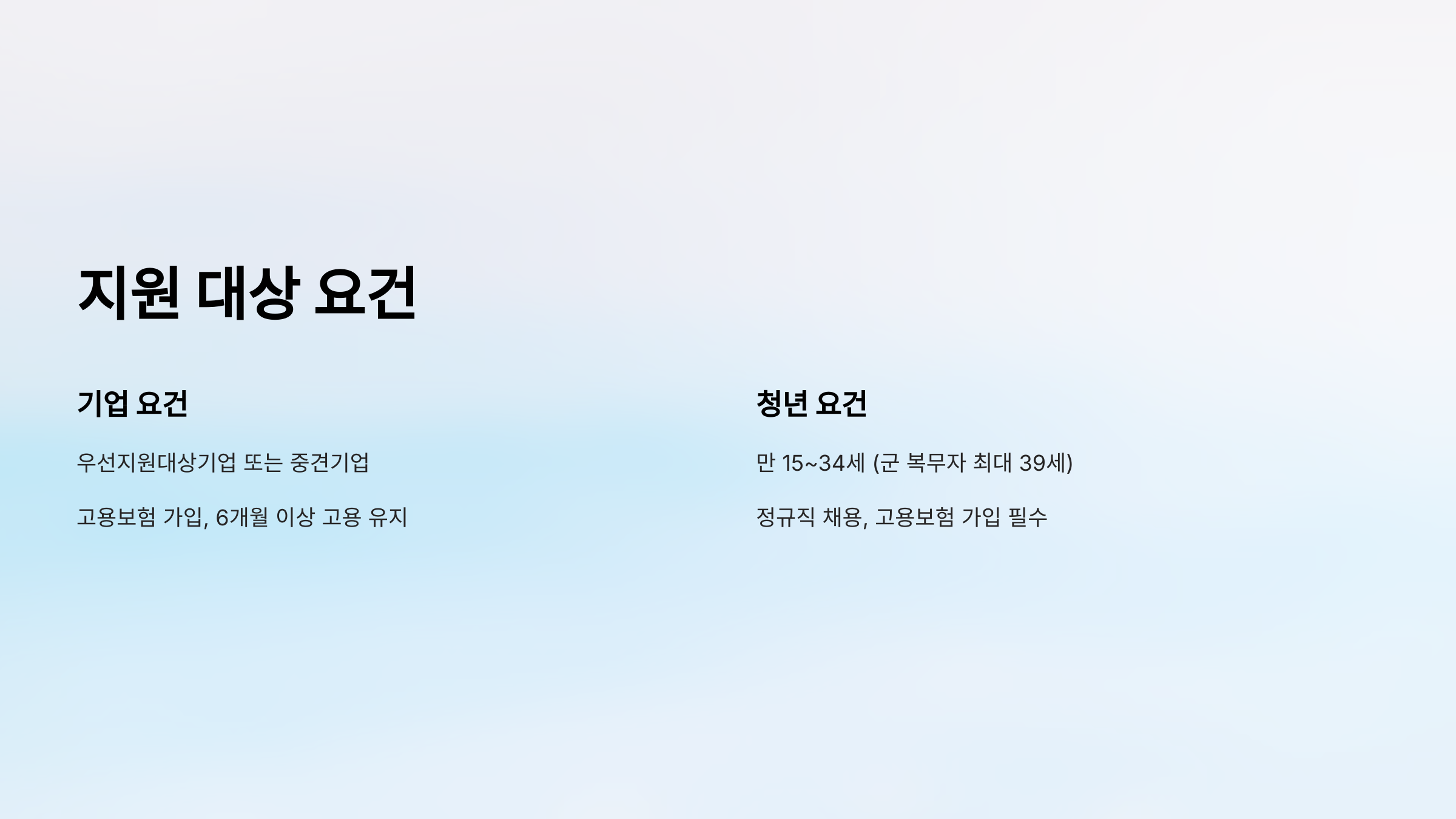 - 청년 요건: 만 15~34세(군 복무자는 만 39세), 정규직 채용, 고용보험 가입 필수.