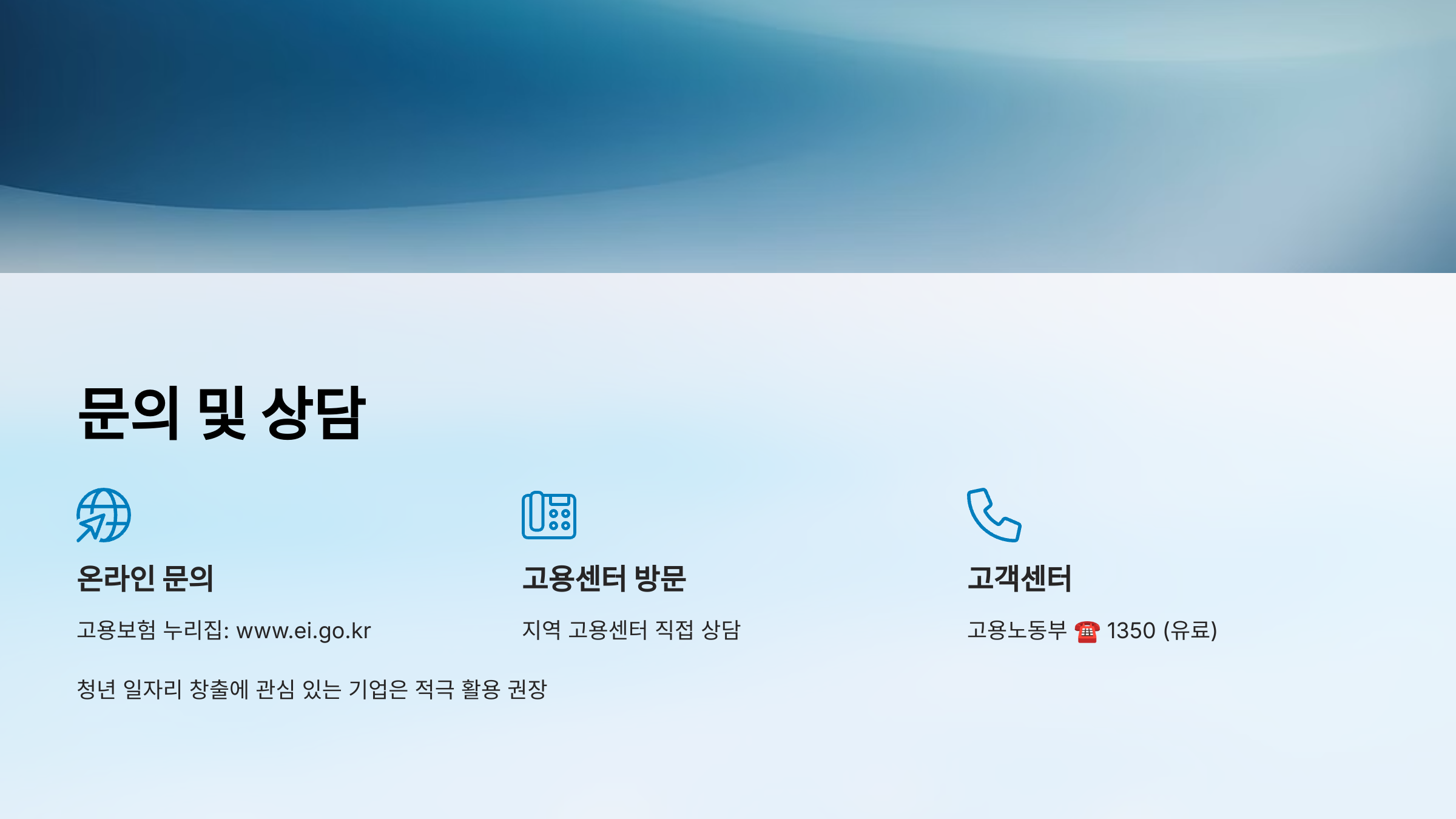 청년일자리 도약장려금은 청년에게는 안정적인 일자리를, 기업에게는 인건비 지원을 통해 고용 부담을 줄여주는 소중한 제도입니다. 청년 일자리 창출에 관심 있는 기업이라면, 요건과 절차를 잘 확인하여 적극적으로 활용해 보세요. 더 궁금한 점이 있다면 고용노동부 고객센터(☎ 1350) 또는 지역 고용센터를 통해 상세히 알아보실 수 있습니다.