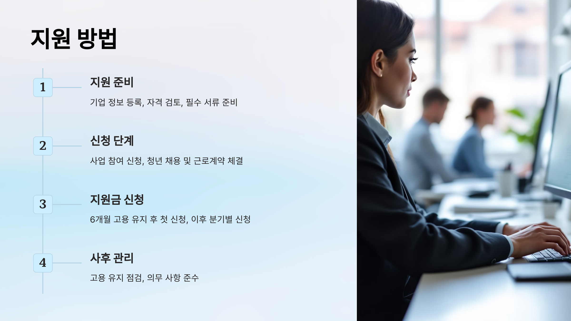 청년일자리 도약장려금은 기업이 청년을 정규직으로 채용하고 일정 요건을 충족했을 때, 고용유지 확인 절차를 거쳐 지원금을 신청하는 제도입니다. 아래는 단계별로 상세한 지원 방법을 정리한 내용입니다.