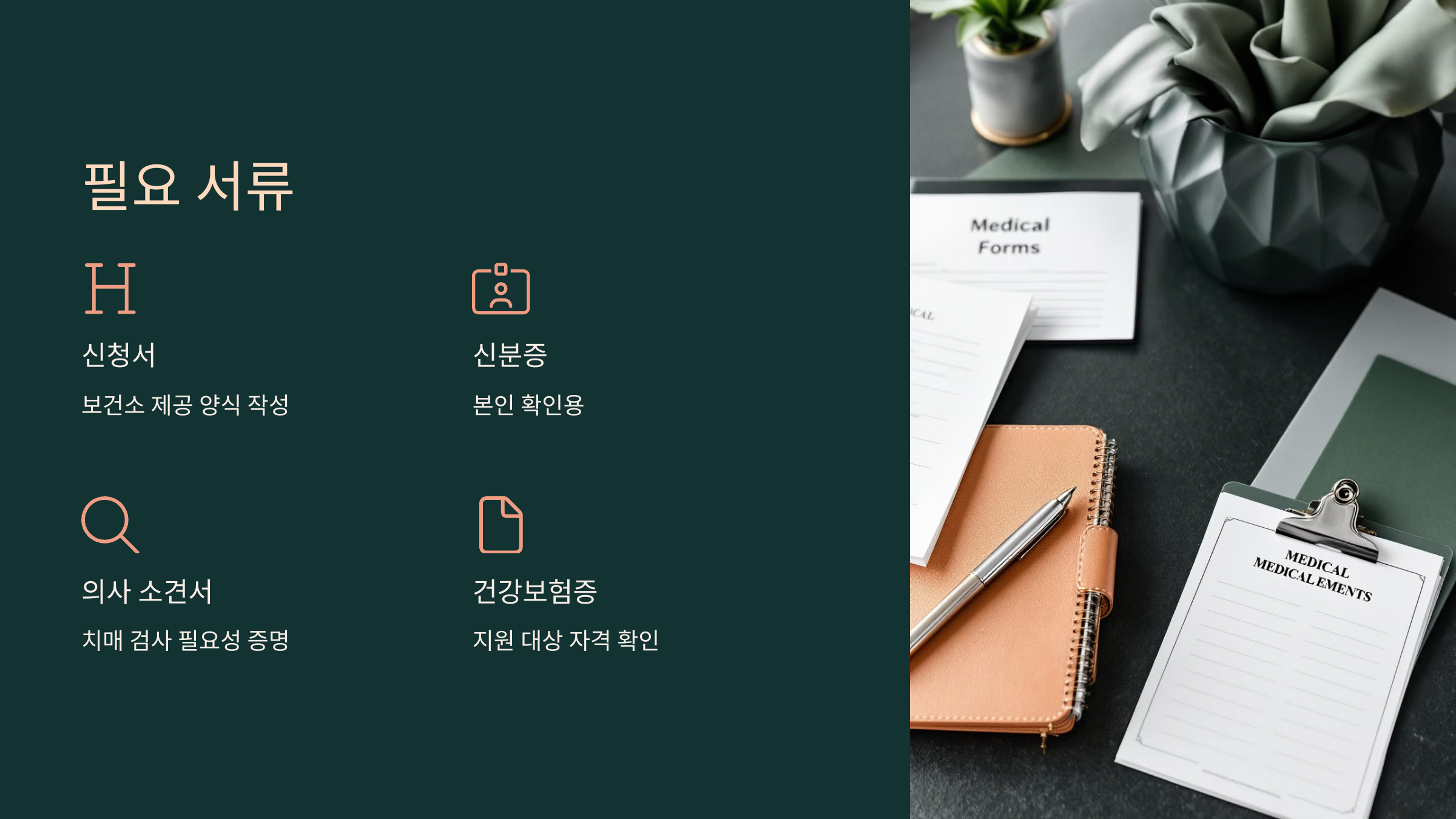 - 치매검사비 지원 신청서: 보건소에서 제공하는 양식을 작성하여 제출합니다.
