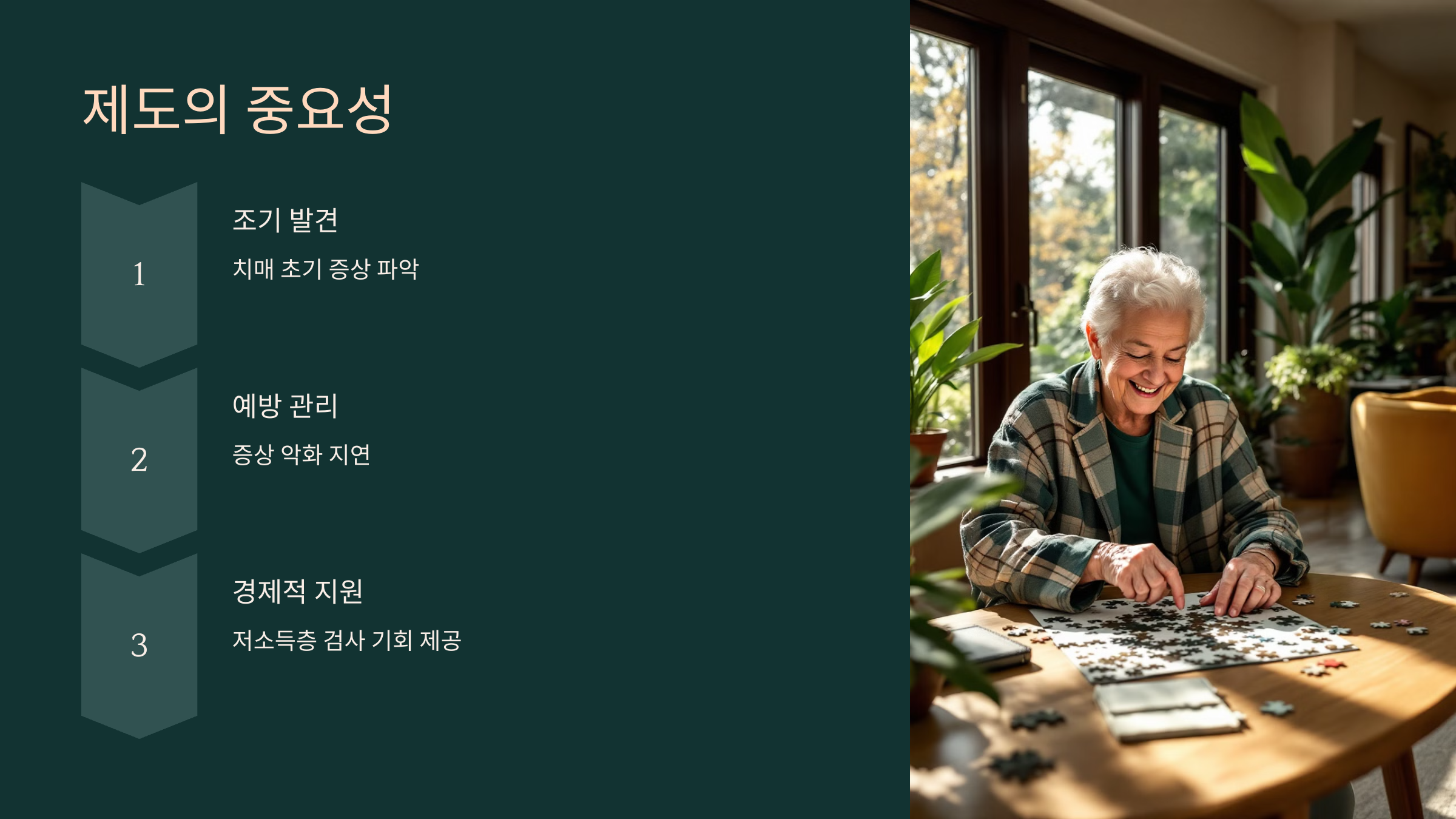 치매검사비 지원 제도는 단순히 검사비용을 지원하는 것을 넘어, 치매의 조기 발견과 예방, 관리의 중요한 수단으로 활용됩니다. 치매는 초기에 발견할수록 증상 악화를 늦추고, 치료나 예방에 보다 효과적이기 때문에 정기적인 검사가 필수적입니다. 이 제도를 통해 경제적 어려움으로 인해 검사를 받지 못하는 고령층도 부담 없이 치매 검사를 받을 수 있어 치매 조기 관리가 가능해집니다.