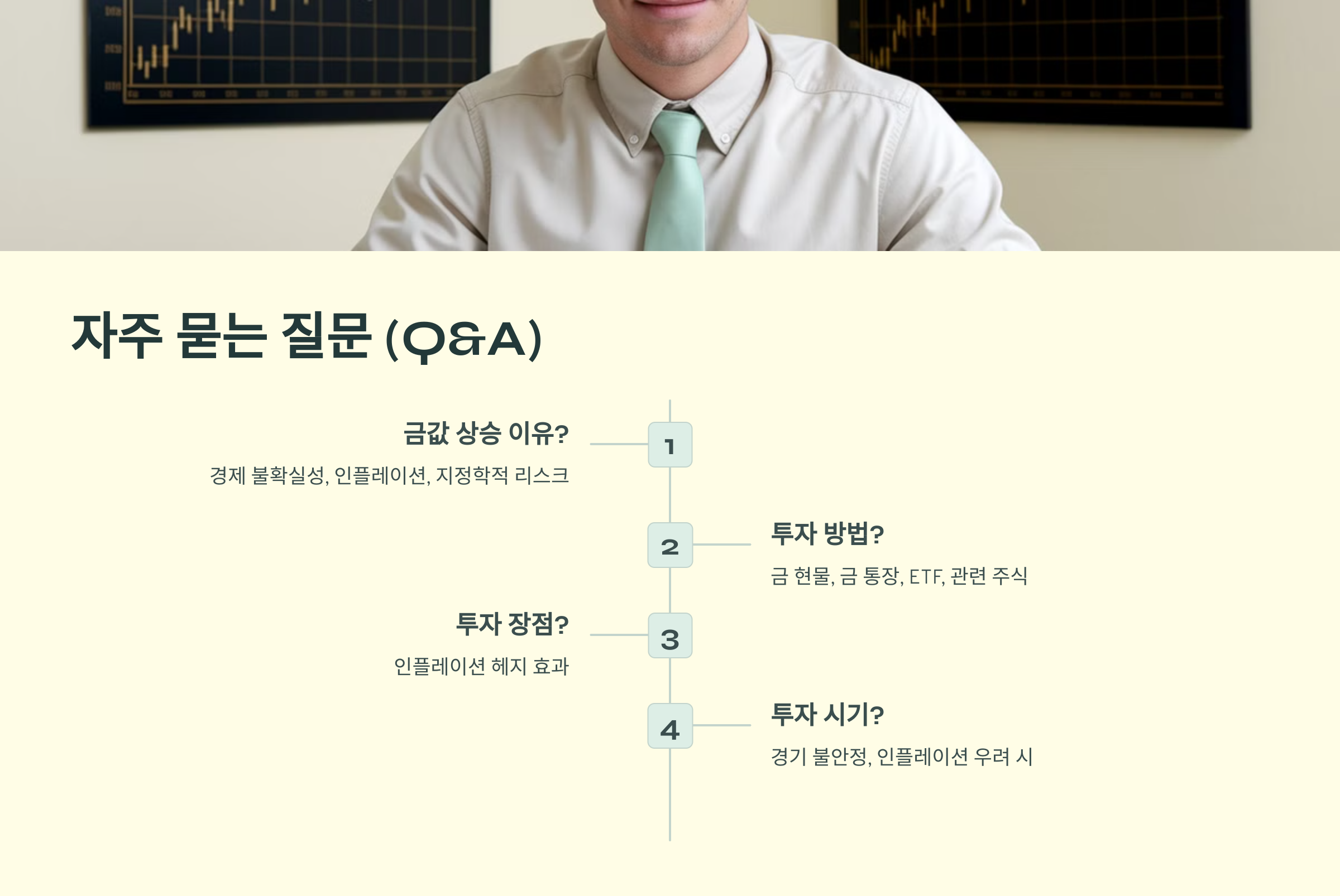 | 금 투자의 장점은 무엇인가요? | 안전자산으로서 인플레이션 헤지 효과가 있습니다. |