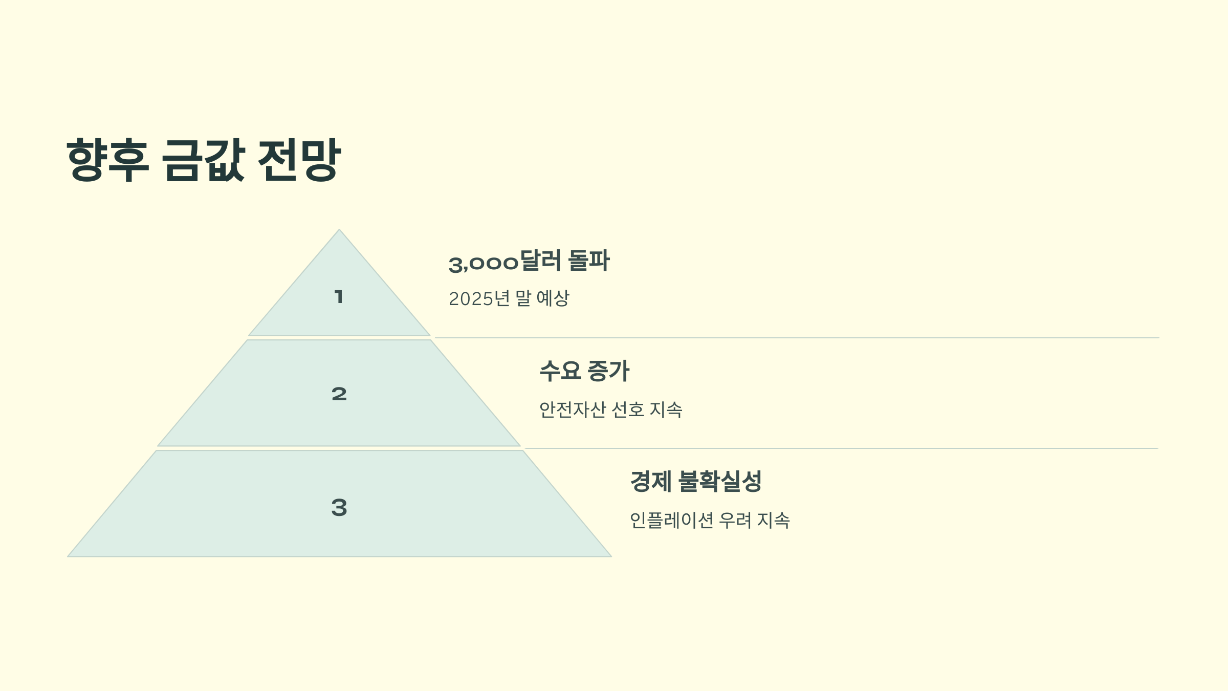 전문가들은 2025년 말까지 금값이 온스당 3,000달러를 돌파할 가능성이 높다고 보고 있습니다. 세계 경제의 불확실성과 인플레이션 우려가 지속되는 한, 금에 대한 수요는 더욱 증가할 것으로 예상됩니다.