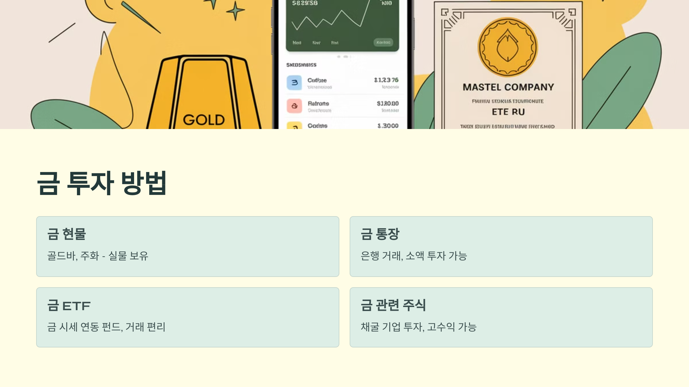 금에 투자하는 방법은 다양합니다. 각 방법은 투자 목적과 기간에 따라 선택할 수 있습니다.
