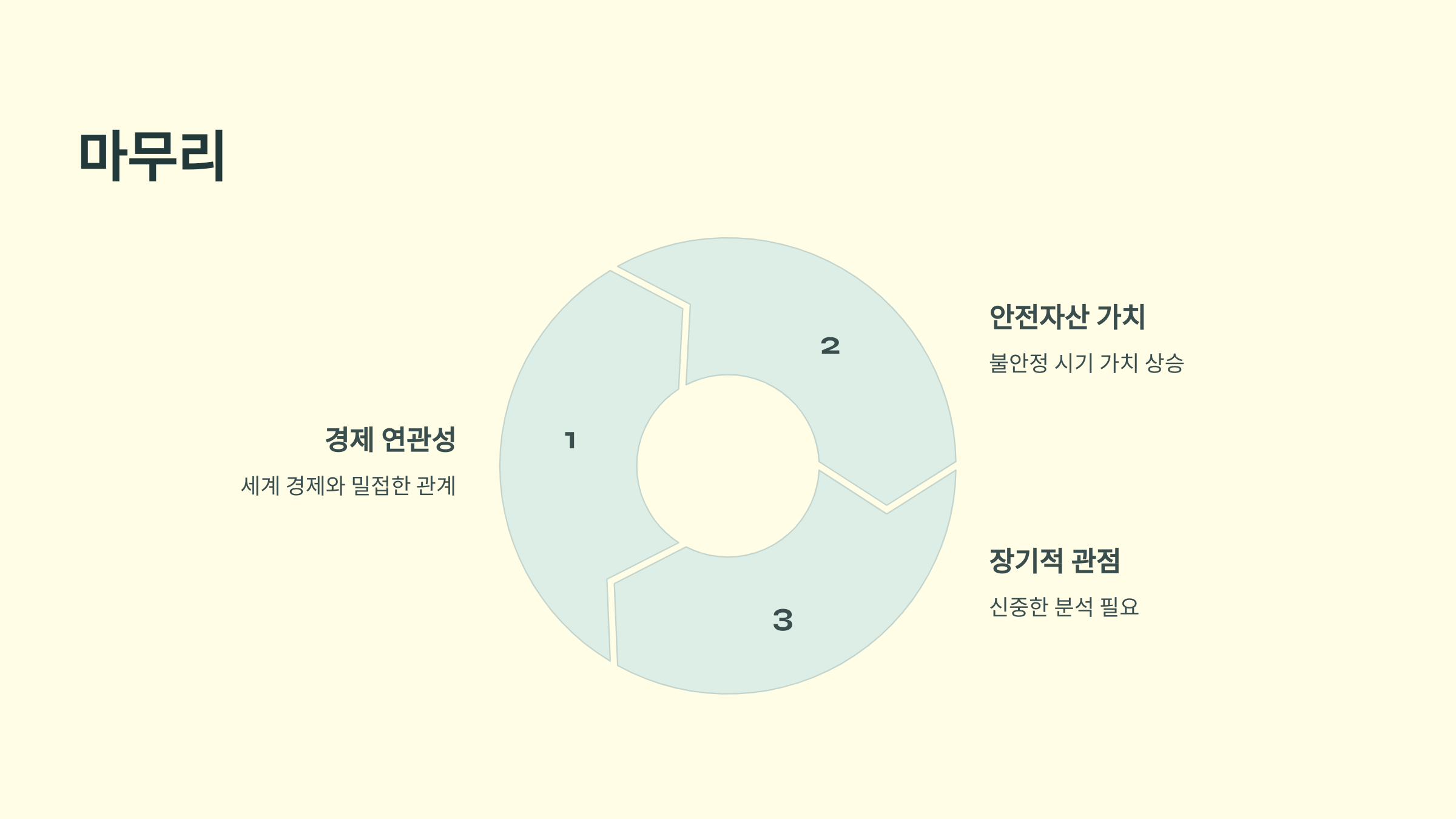 - 달러 약세: 미국 달러 가치 하락으로 인한 금의 상대적 가치 상승