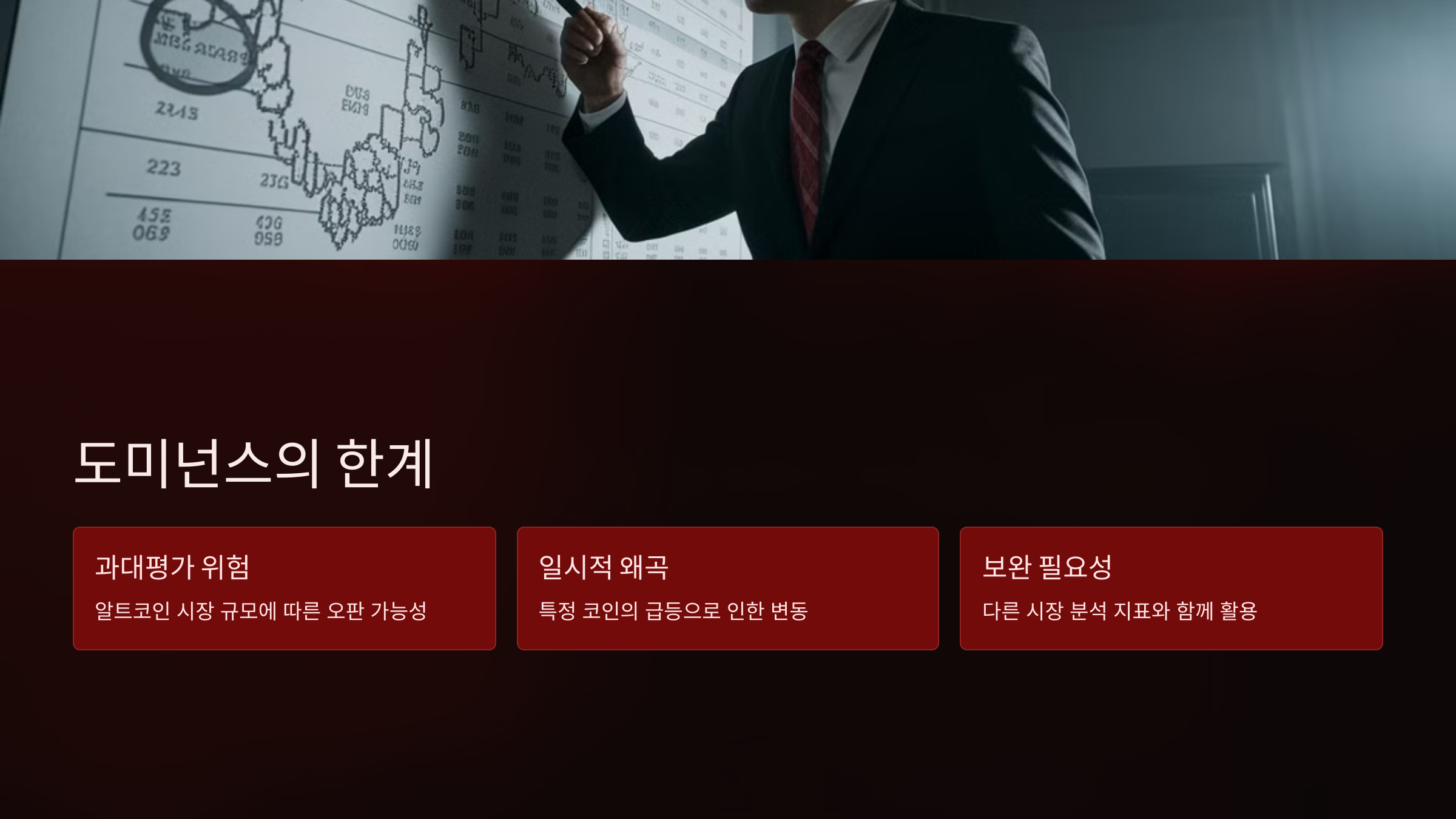 - 알트코인 시장이 지나치게 작거나 과대 평가된 경우, 도미넌스 수치만으로 시장 흐름을 오판할 가능성이 있습니다.