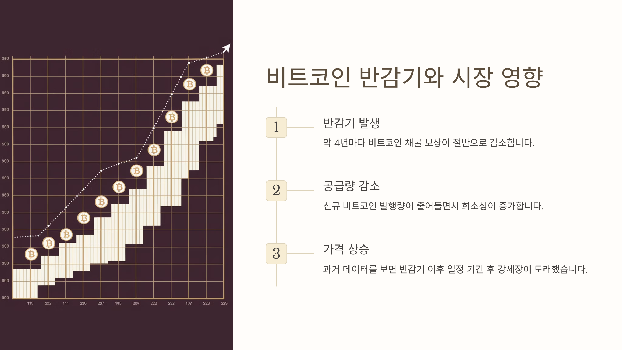 | 3. 비트코인 반감기가 코인 시장에 어떤 영향을 주나요? | 반감기 이후 비트코인 공급량이 줄어들면서 희소성이 증가하고, 역사적으로 일정 기간 후 강세장이 도래하는 경향이 있습니다. |