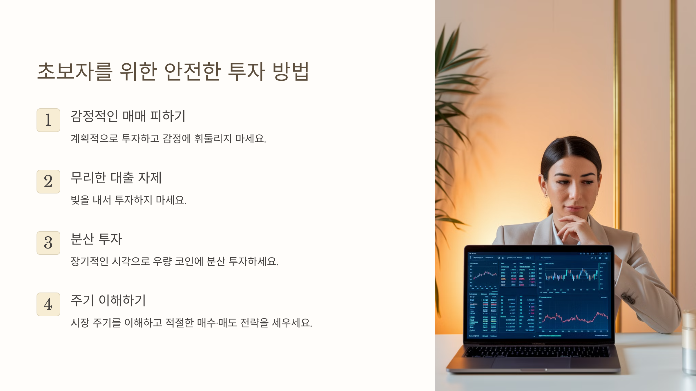 | 4. 초보자는 어떤 투자 전략을 따라야 하나요? | 감정적인 매매를 피하고, 분산 투자와 장기 투자를 기본 원칙으로 삼는 것이 좋습니다. 또한, 코인의 주기를 이해하고 적절한 매수·매도 시점을 찾는 것이 중요합니다. |