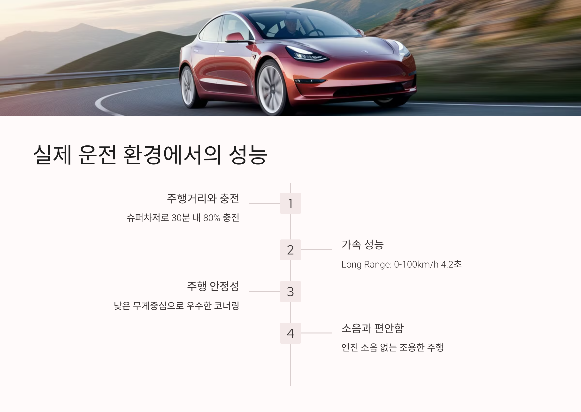 테슬라 모델 3는 실제 운전 환경에서 매우 뛰어난 성능을 발휘하는 전기차입니다. 즉각적인 가속력과 정밀한 핸들링, 주행 안정성 등은 운전자를 만족시킬 만한 요소가 많습니다. 또한, 주행 거리와 충전 속도도 매우 우수하여, 장거리 운전에도 적합합니다. 전기차 특유의 조용하고 편안한 주행은 운전의 즐거움을 더욱 향상시키며, 다양한 운전 모드를 통해 운전자가 원하는 스타일에 맞춰 주행할 수 있습니다.