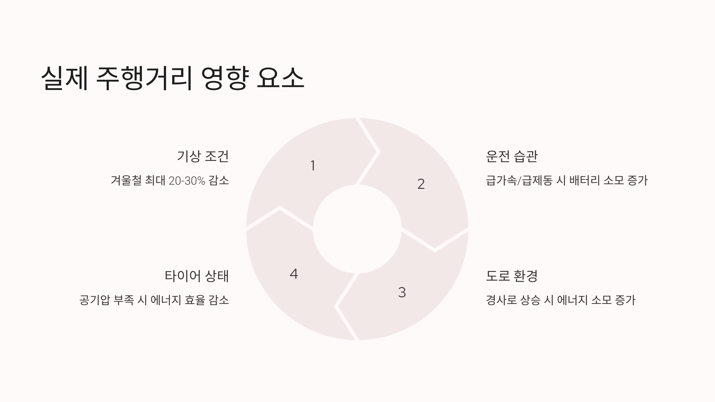 - 기상 조건: 겨울철에는 배터리 효율이 감소하여 주행거리가 줄어들 수 있습니다. 추운 날씨에서는 배터리의 화학 반응이 느려지기 때문에, 주행거리가 20% 정도 줄어들 수 있습니다.