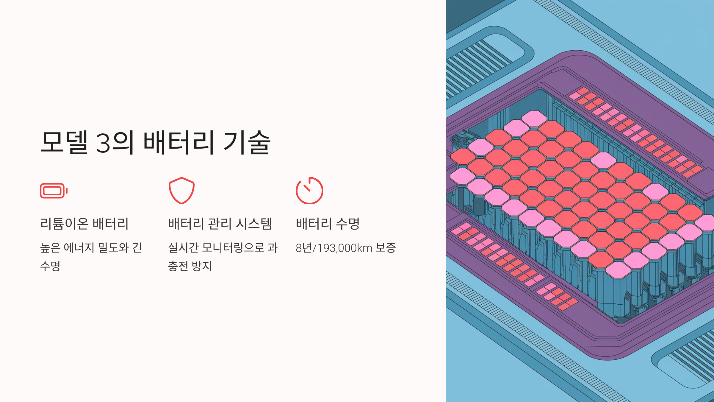 테슬라 모델 3는 리튬 이온 배터리를 사용하며, 배터리의 효율성과 수명은 주행거리와 직결됩니다. 테슬라는 **배터리 관리 시스템(BMS)**을 통해 배터리의 성능을 최적화하고, 충전 시 과충전 방지 및 배터리 수명 연장을 지원합니다. 이 시스템 덕분에 장기간 사용하더라도 일정한 성능을 유지할 수 있습니다.