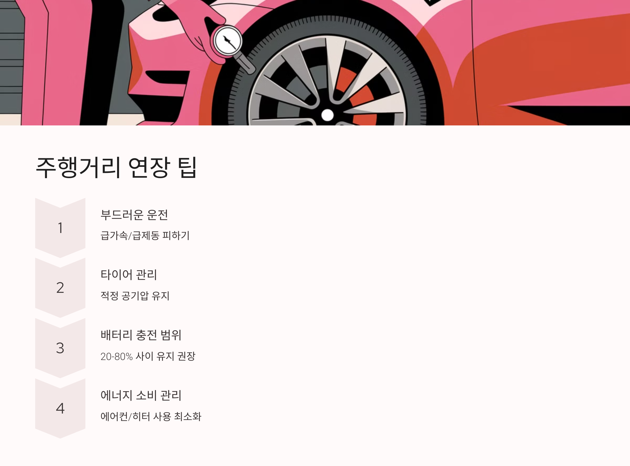 - 네, 배터리 관리는 주행거리뿐만 아니라 배터리 수명에도 큰 영향을 미칩니다. 100% 충전보다는 80~90% 충전 상태를 유지하는 것이 좋습니다.