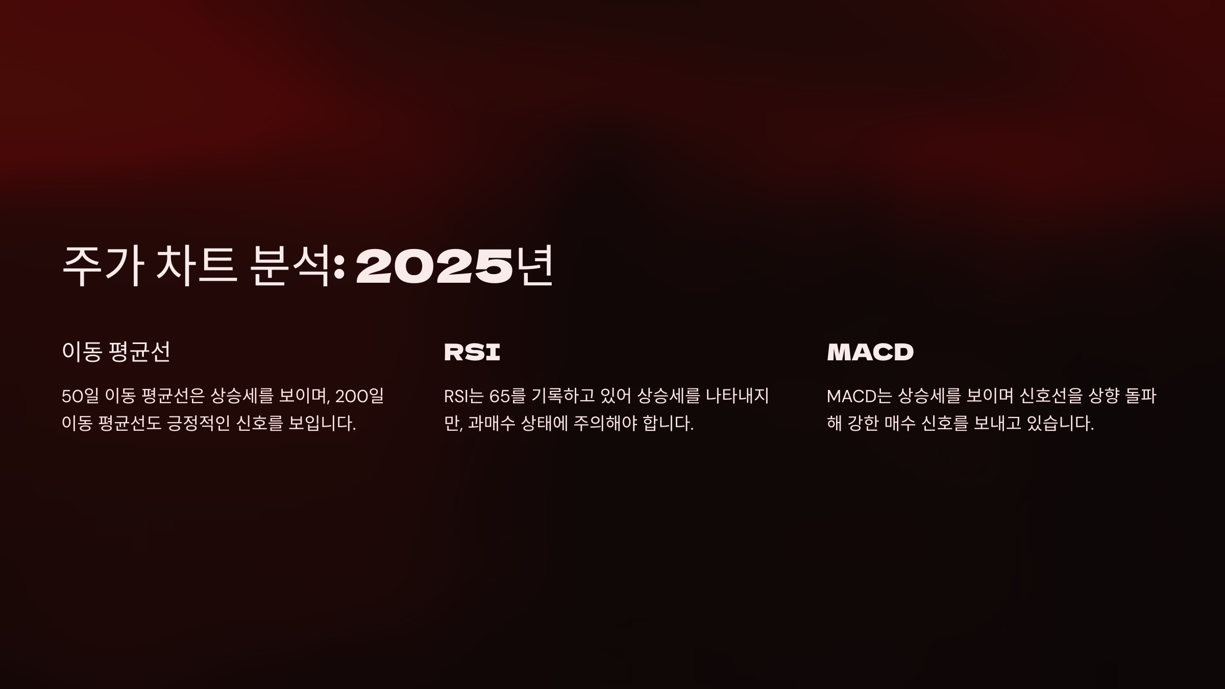 2025년 초반 테슬라는 주가가 급등했지만, 시장 불확실성으로 인해 조정이 발생하기도 했습니다. 주요 기술적 지표는 여전히 긍정적인 신호를 보내고 있으며, 장기 투자에 유리한 상황을 이어가고 있습니다.