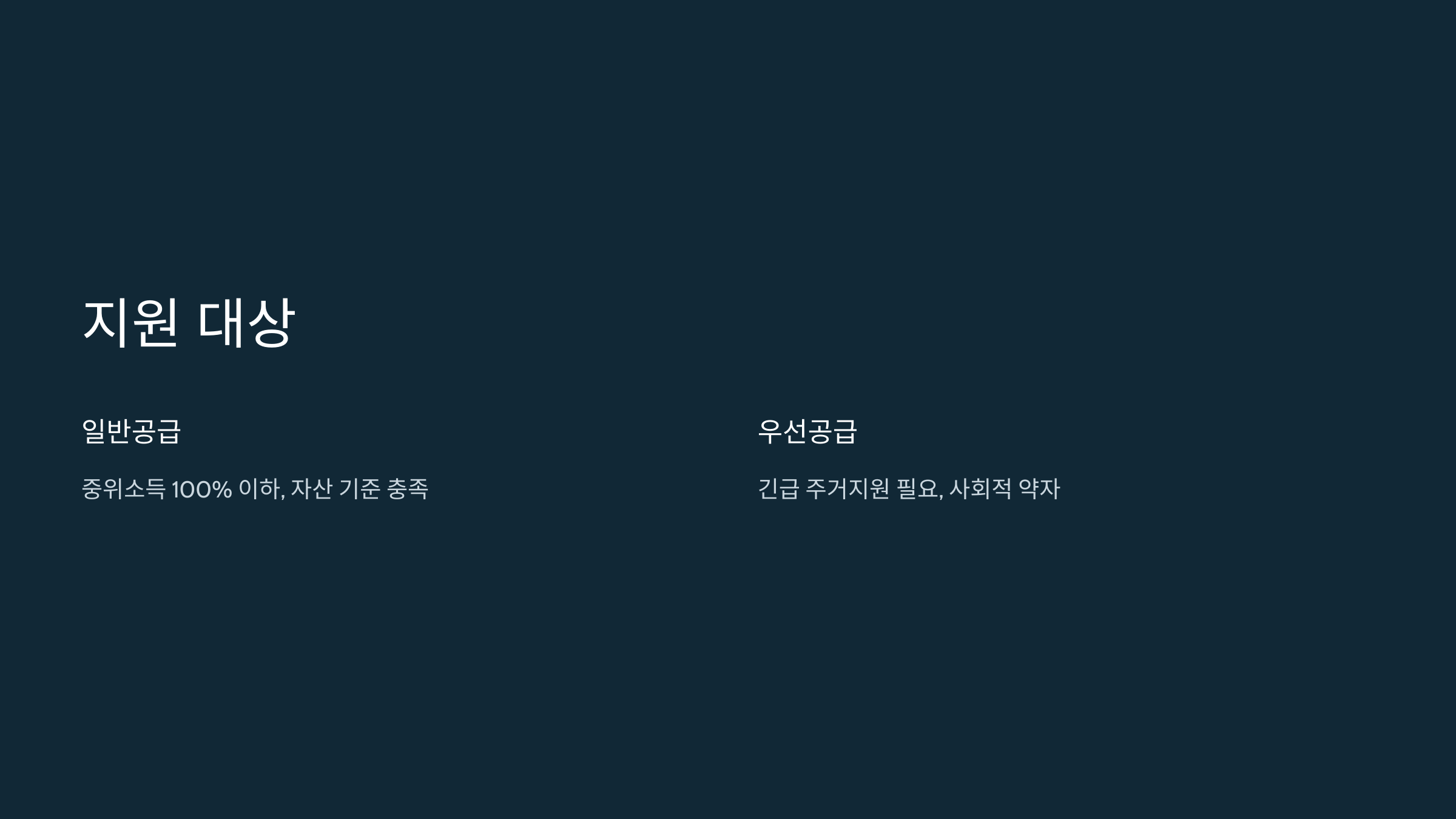 | 대상자 정의 | - 소득 및 자산 기준을 충족하는 가구 | - 긴급한 주거지원이 필요한 가구 및 특정 사회적 약자 |