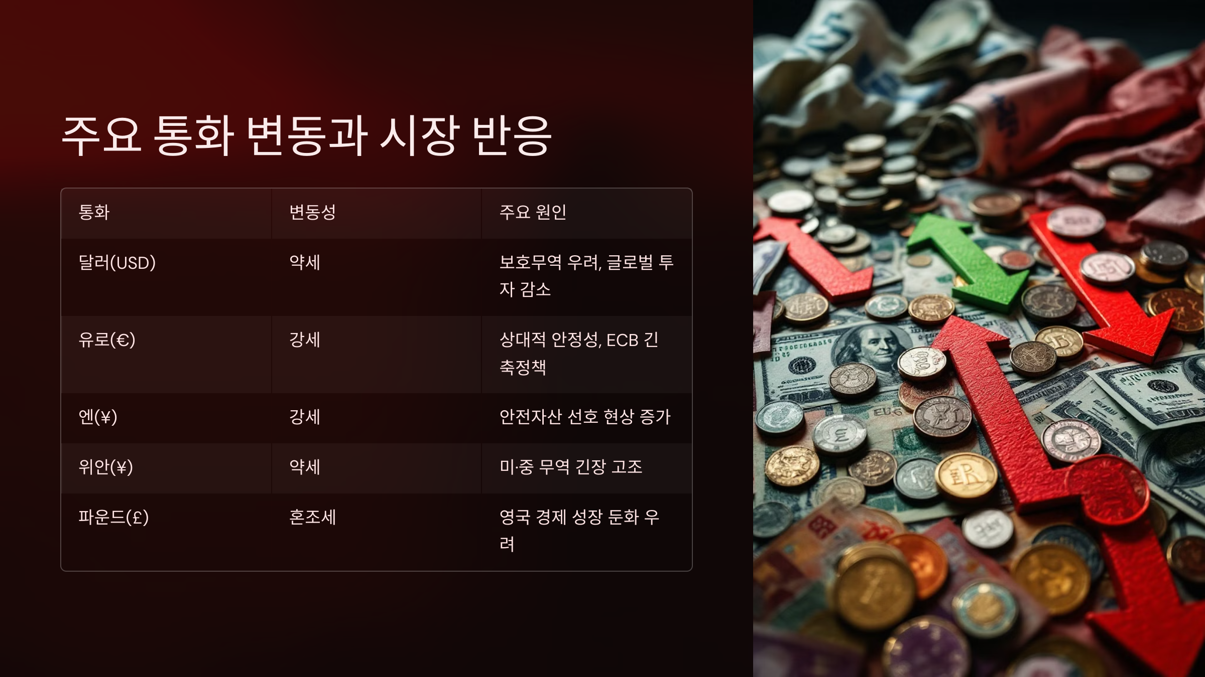 | 달러(USD) | 약세 | 보호무역 우려, 글로벌 투자 감소 |