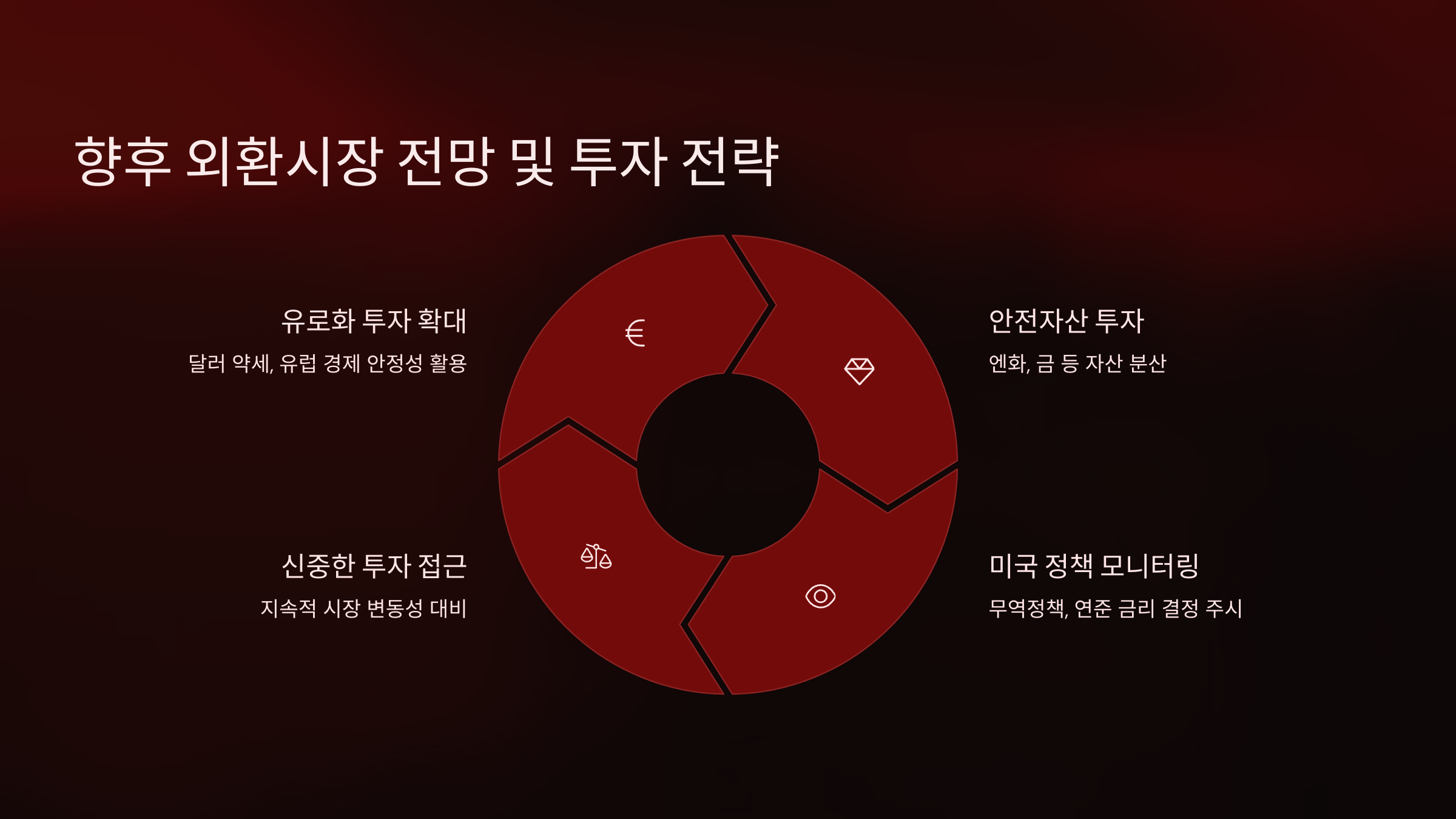 향후 외환시장은 미국과 교역국 간 무역 협상의 진행 상황에 따라 변동성이 지속될 가능성이 큽니다. 투자자들은 다음과 같은 전략을 고려할 수 있습니다.