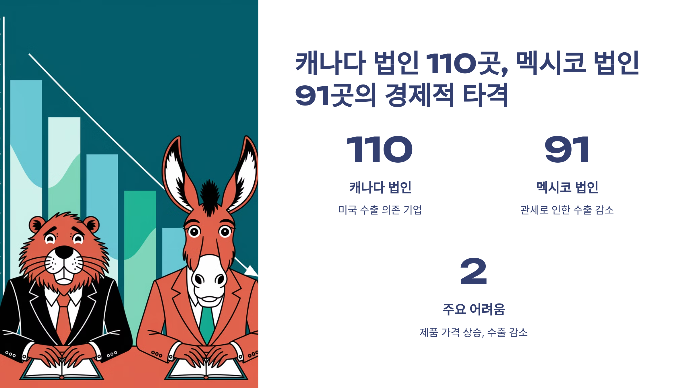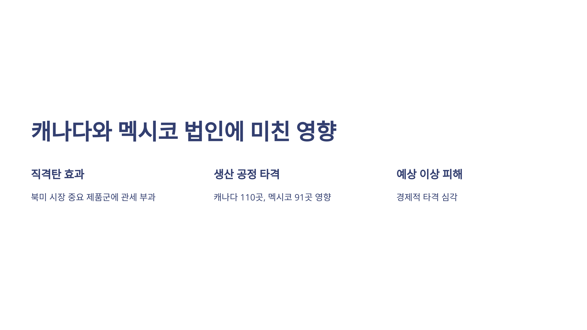 | 3. 캐나다 법인 110곳과 멕시코 법인 91곳의 피해는 얼마나 컸나요? | 두 나라의 법인들은 대부분 미국에 수출하는 기업들이었으며, 그로 인해 수출 감소와 생산 비용 증가로 경제적 타격을 받았습니다. |