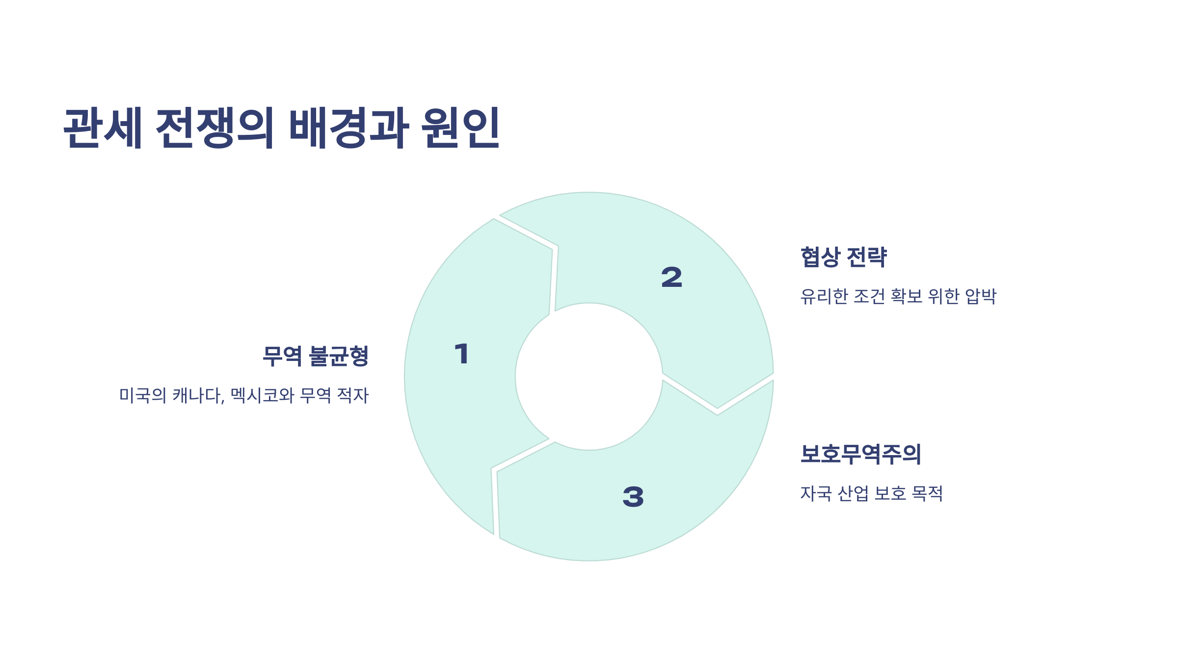트럼프 대통령은 무역 불균형을 해결하기 위해 "America First"라는 구호 아래에서 강력한 관세 정책을 추진했습니다. 특히, 미국은 캐나다와 멕시코와의 무역에서 적자를 보고 있었고, 이를 해결하기 위해 높은 세율을 부과하게 되었습니다. 또한, 다른 나라들과의 무역 협상에서 유리한 조건을 얻어내기 위한 전략으로 관세 전쟁이 일어났습니다.