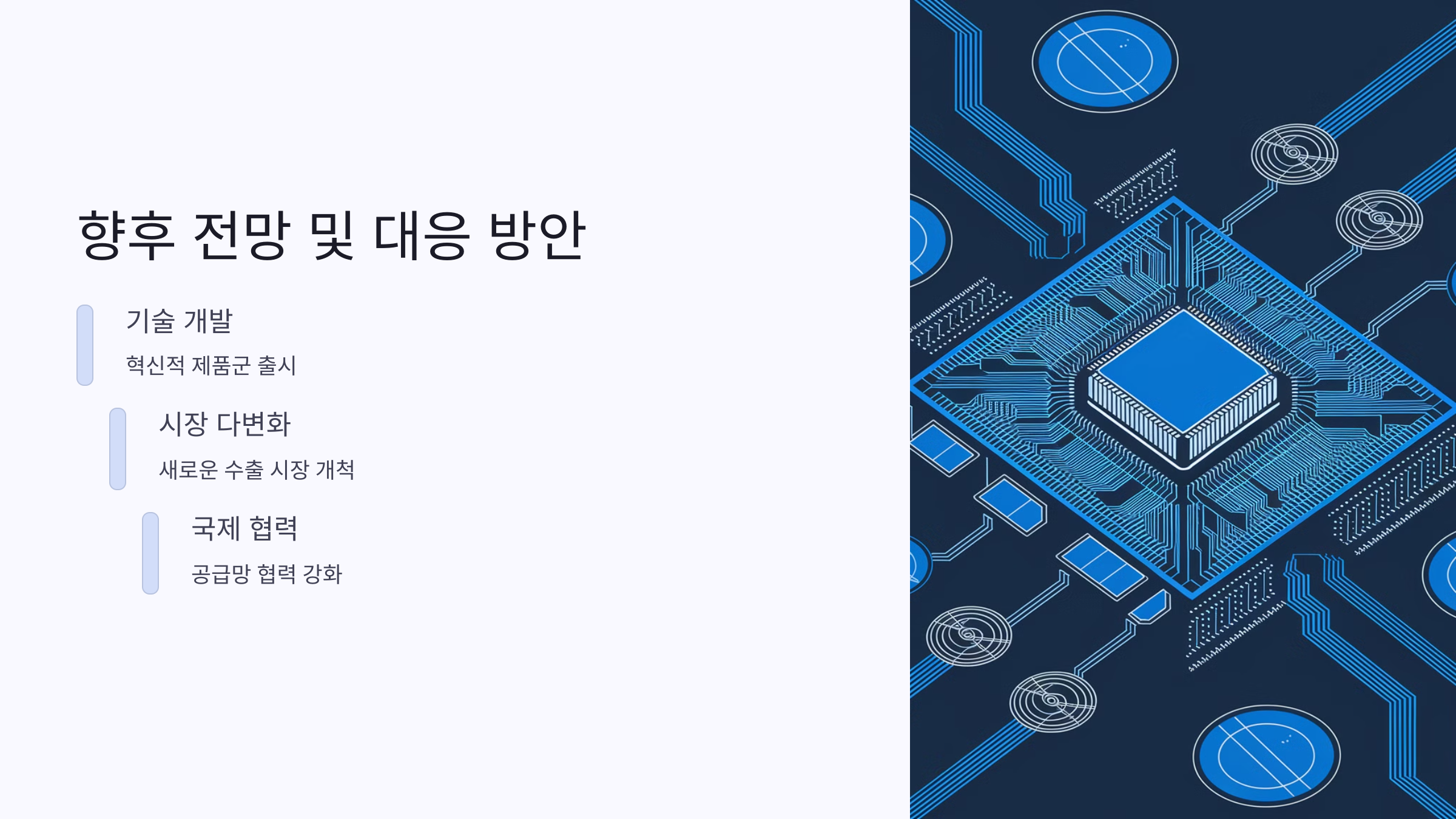 | 국제 협력 강화 | 국제적인 반도체 공급망 협력 및 새로운 무역 협정 체결을 위한 노력이 필요함. |