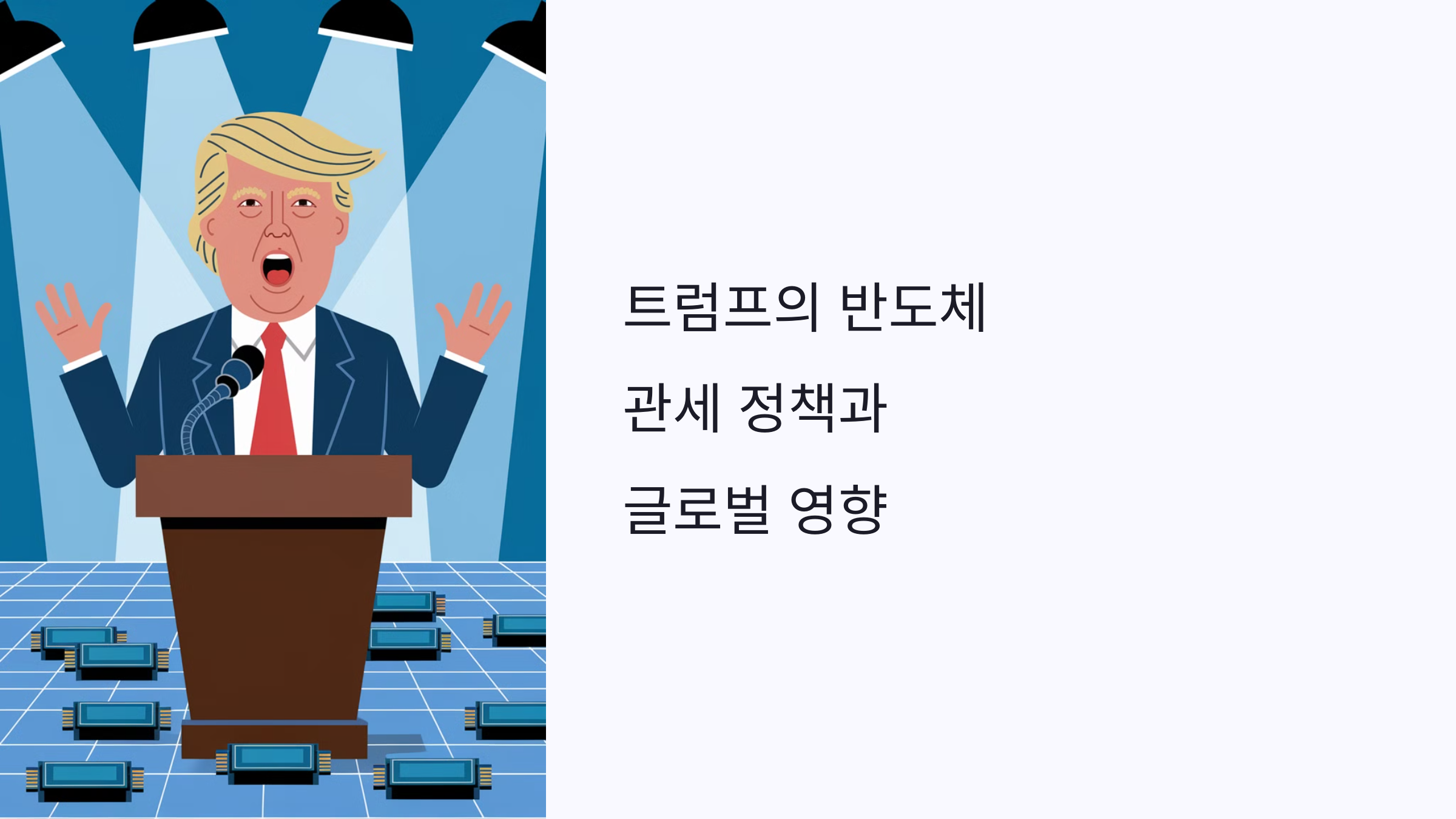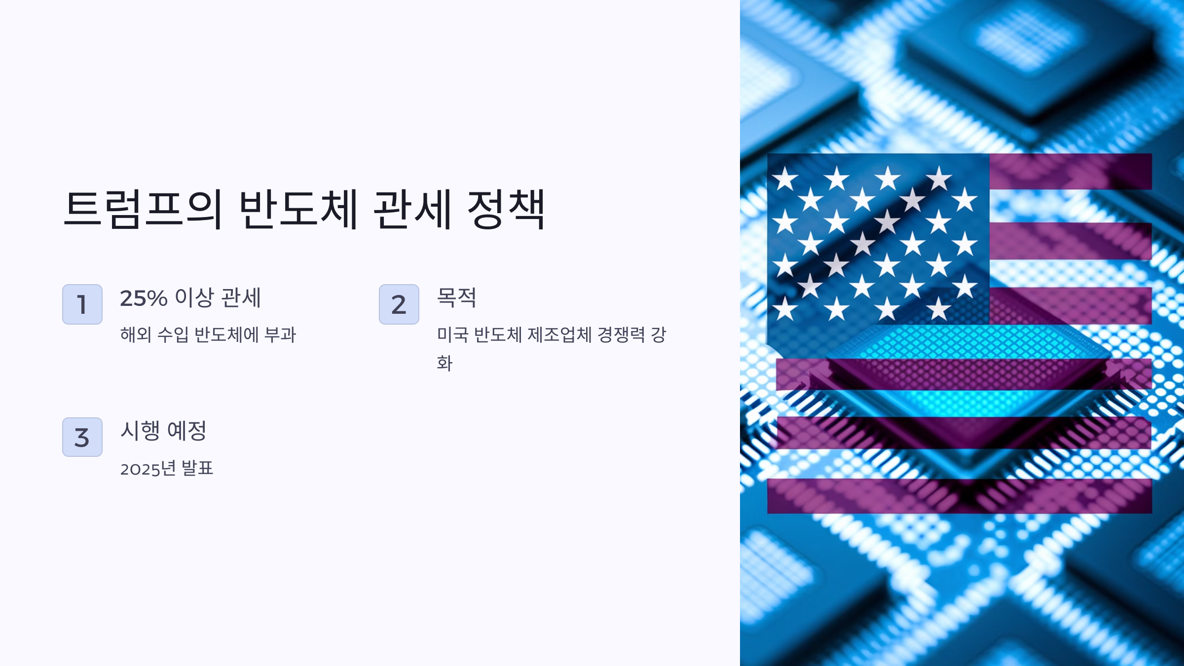 2025년, 도널드 트럼프 전 미국 대통령은 자국의 반도체 산업을 보호하기 위해 해외에서 수입되는 반도체에 대해 25% 이상의 관세를 부과할 것이라고 발표했습니다. 이 정책은 미국의 반도체 제조업체들의 경쟁력을 높이고, 자국 내 반도체 생산을 장려하려는 목적이 있습니다.