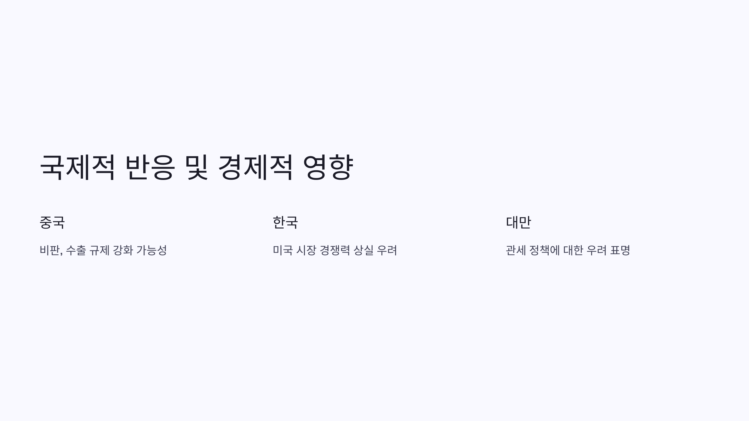 | 중국 | 미국의 반도체 산업 보호 조치를 비판하며, 반도체 수출에 대한 규제를 강화할 가능성 있음. |