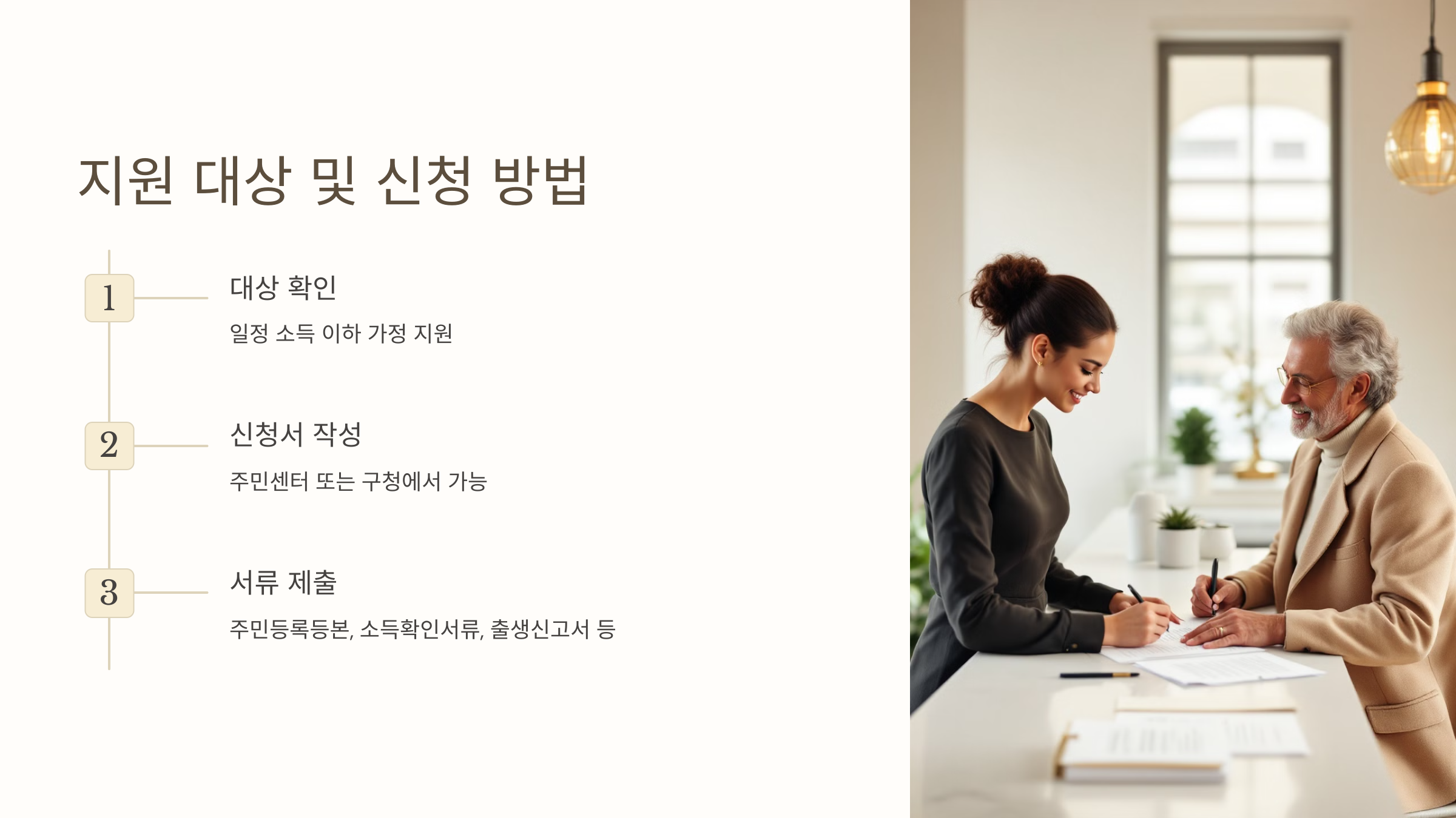해산급여의 지원 대상은 출산 후 일정 소득 이하의 가정으로, 이 지원을 통해 필요한 비용을 일부 충당할 수 있습니다. 신청 방법은 비교적 간단합니다. 주민센터 또는 구청에서 신청서를 작성하고 필요한 서류를 제출하면 됩니다. 필요한 서류로는 신청서, 주민등록등본, 소득 확인 서류(세금 신고서, 급여명세서 등), 출생신고서가 있습니다. 이처럼 간편한 절차는 많은 부모가 이 혜택을 누릴 수 있도록 돕고 있습니다. 신청 시 필요한 서류를 미리 준비하고 확인하는 것이 중요하며, 이를 통해 더욱 원활한 신청이 가능합니다. 이 지원은 단순한 금전적 지원을 넘어, 부모가 아기에게 사랑과 안전을 제공할 수 있는 기반을 마련해 줍니다.