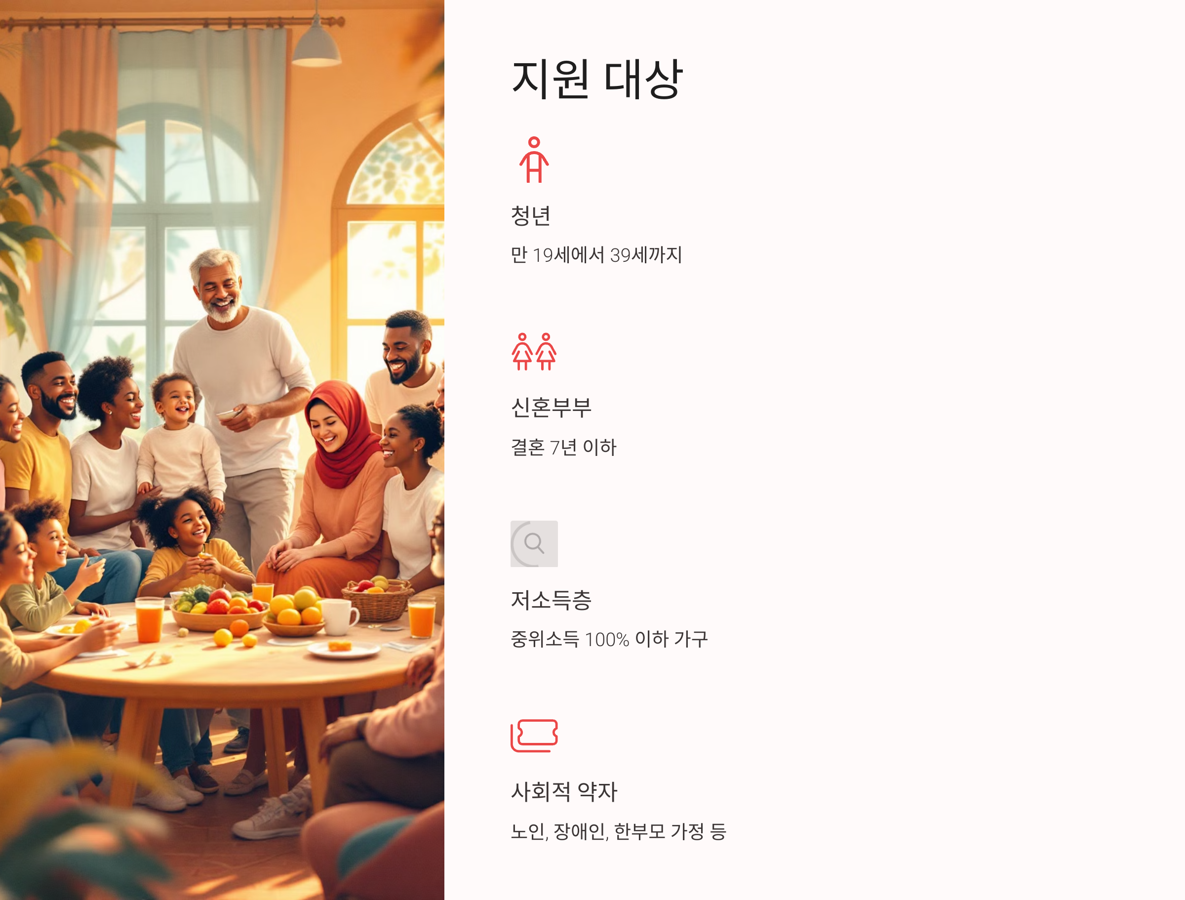 - 저소득층: 소득이 기준 중위소득 100% 이하인 가구로, 경제적 어려움을 겪고 있는 가구에 지원합니다.