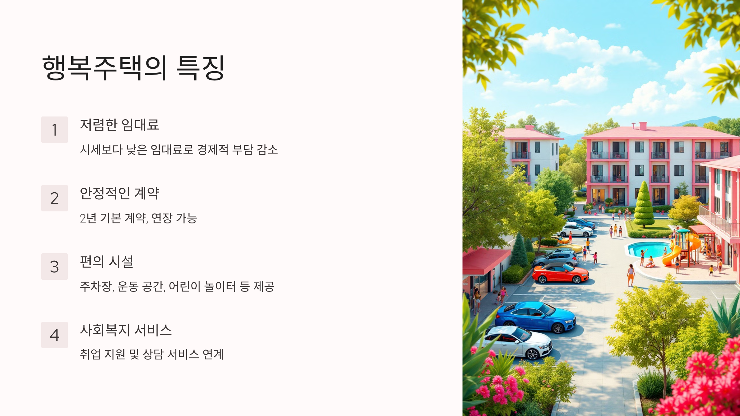 행복주택은 단순한 주거 제공을 넘어, 주민들이 보다 나은 삶을 위해 필요한 모든 지원을 아끼지 않는 따뜻한 공간입니다. 이곳에서 새로운 시작을 하며, 이웃과 함께 행복한 순간을 만들어 나가길 바랍니다. 함께하는 행복, 그 첫걸음을 행복주택에서 시작해 보세요!