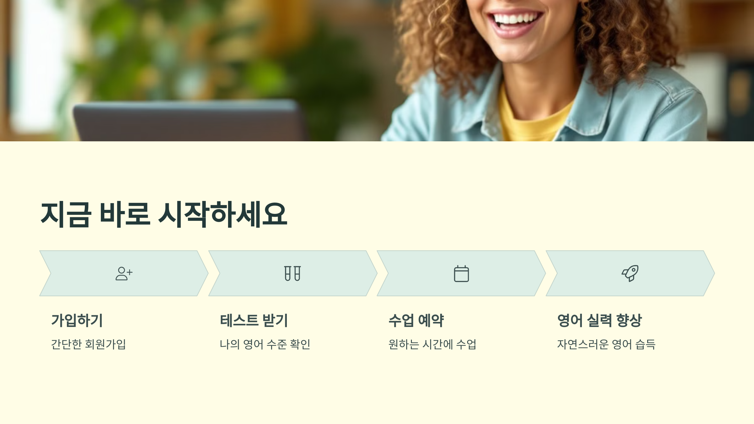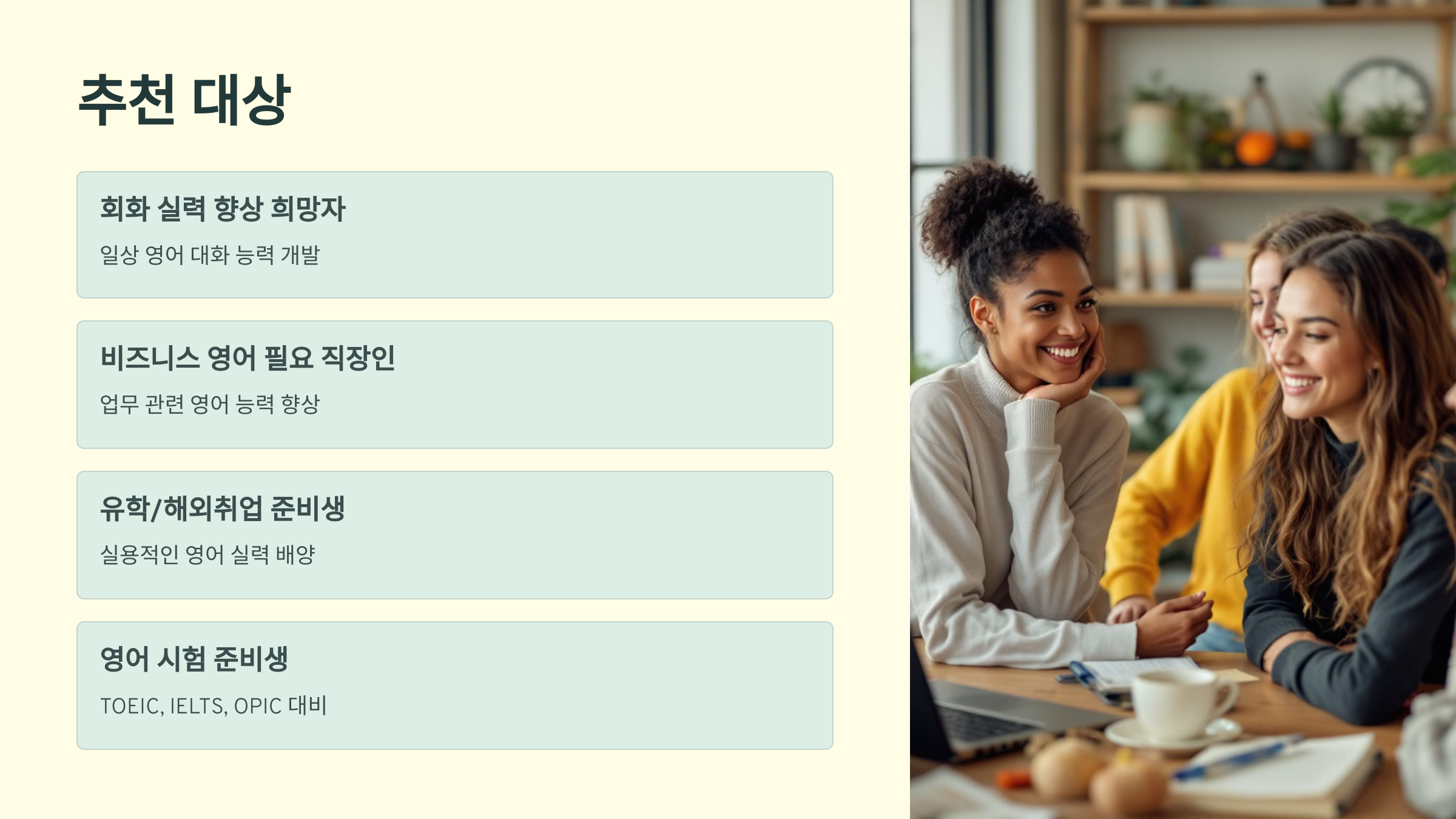 | 🎯 다양한 커리큘럼 | 회화, 비즈니스 영어, 시험 대비(TOEIC, IELTS 등)까지 맞춤형 학습 가능 |