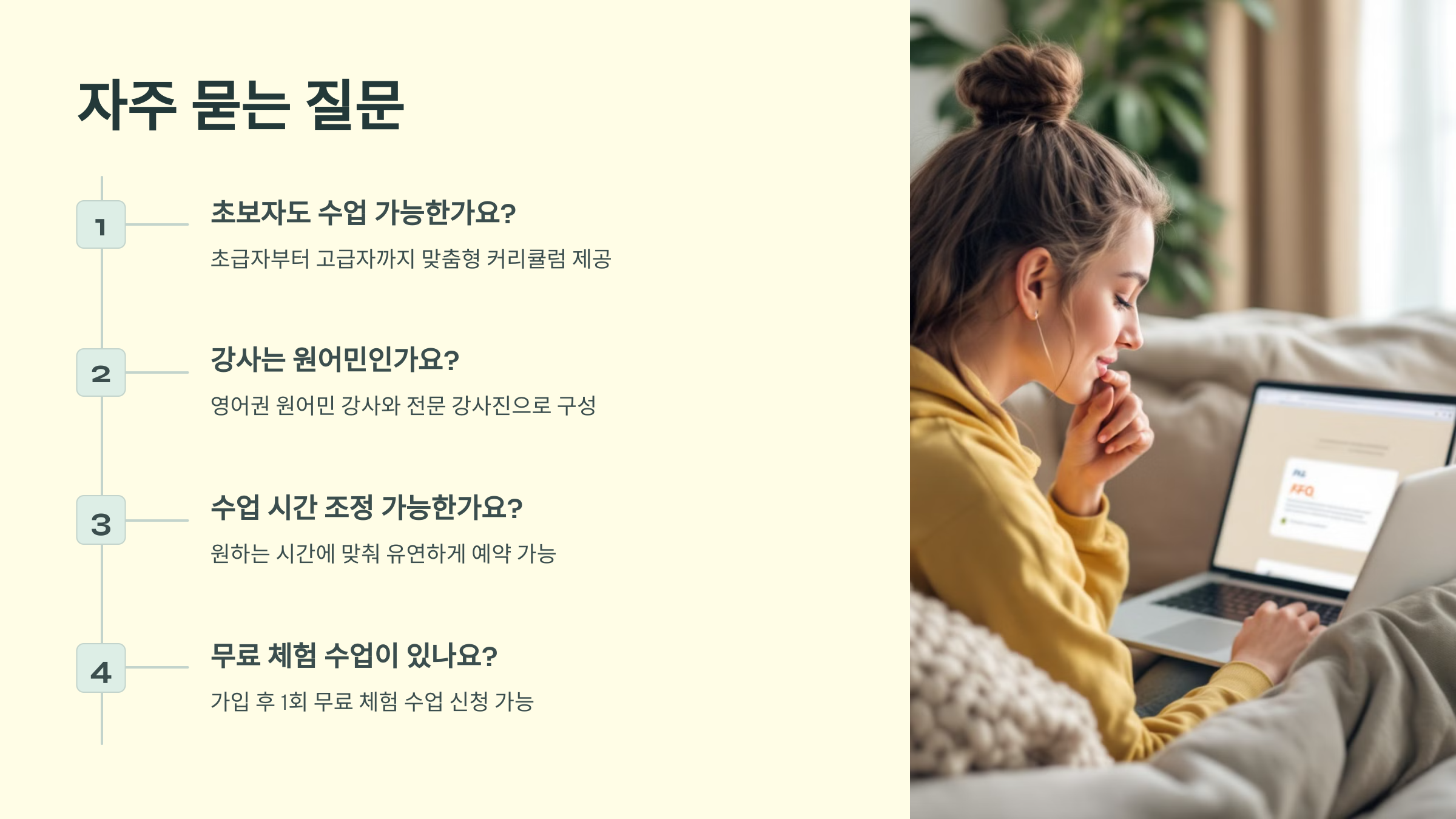 | 무료 체험 수업이 있나요? | 네, 가입 후 1회 무료 체험 수업을 신청할 수 있습니다. |