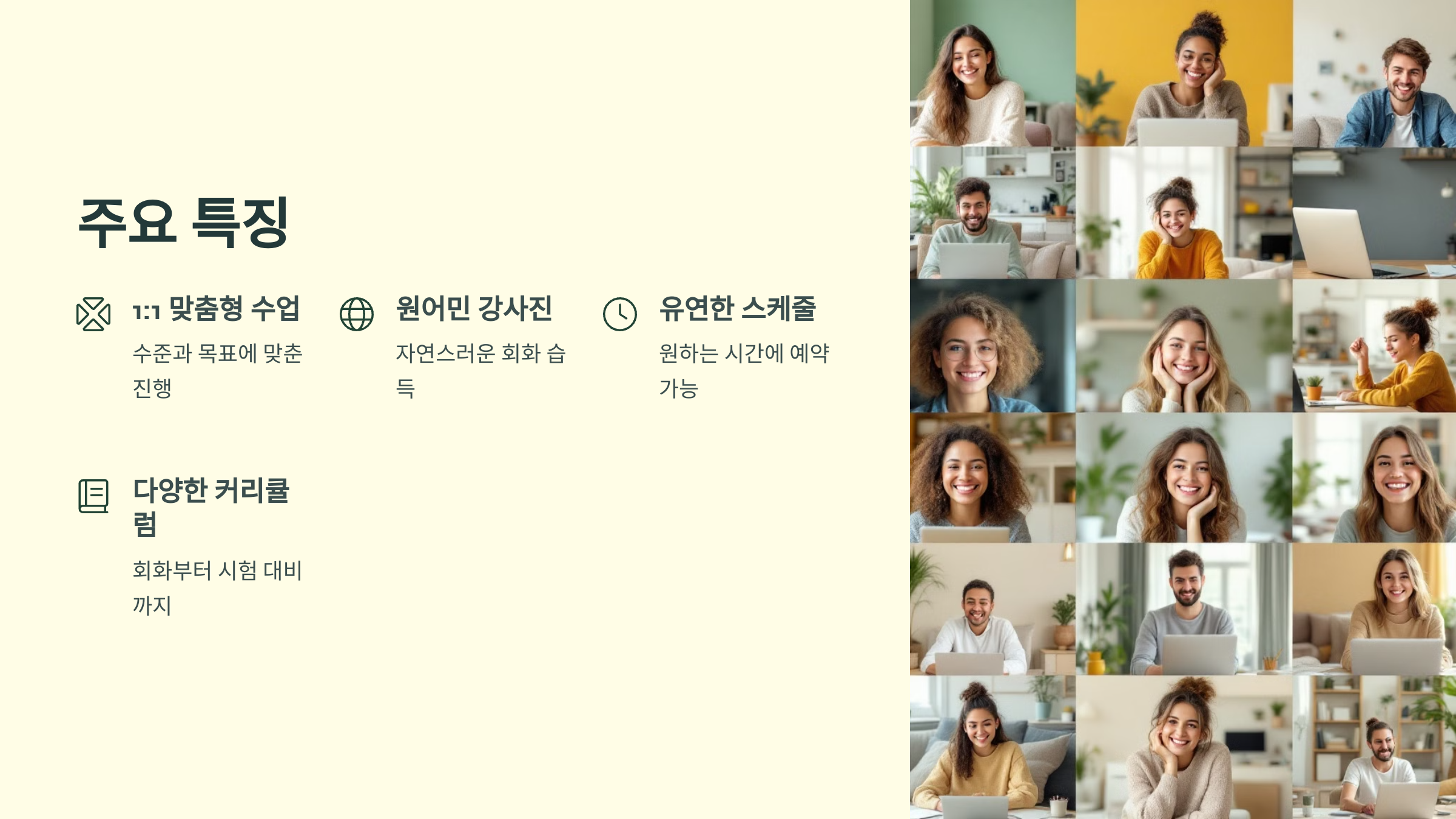 | 🌍 원어민 강사진 | 실제 영어권 강사와의 대화를 통해 자연스러운 회화를 익힐 수 있습니다. |