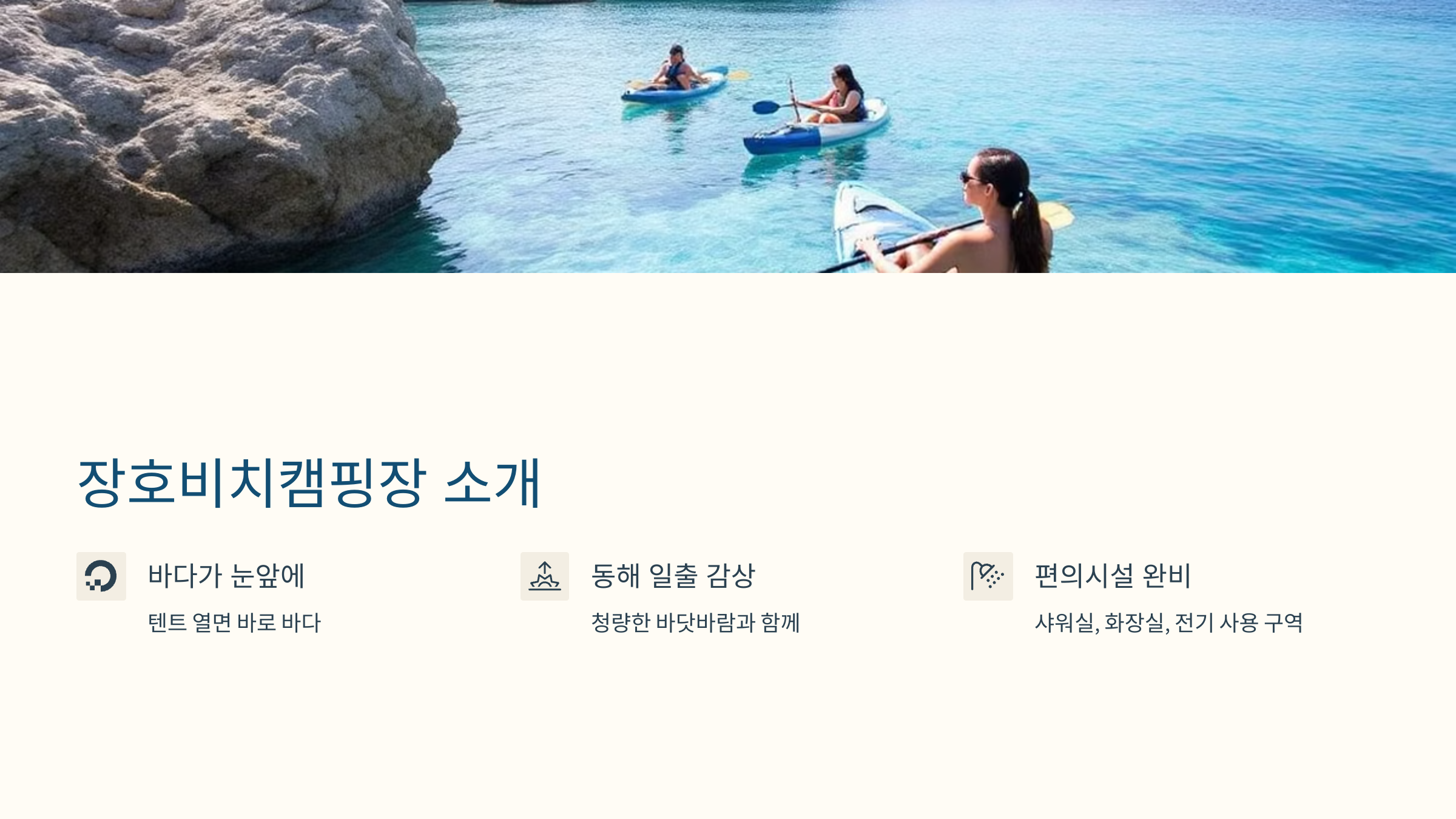 🏕️ 삼척시 장호비치캠핑장, 바다와 하늘이 만나는 감성 캠핑!조용한 동해 바다를 품은 해변가에서 아침을 맞이하고, 별빛 아래에서 하루를 마무리하는 시간.이런 낭만을 꿈꾸는 분이라면, 삼