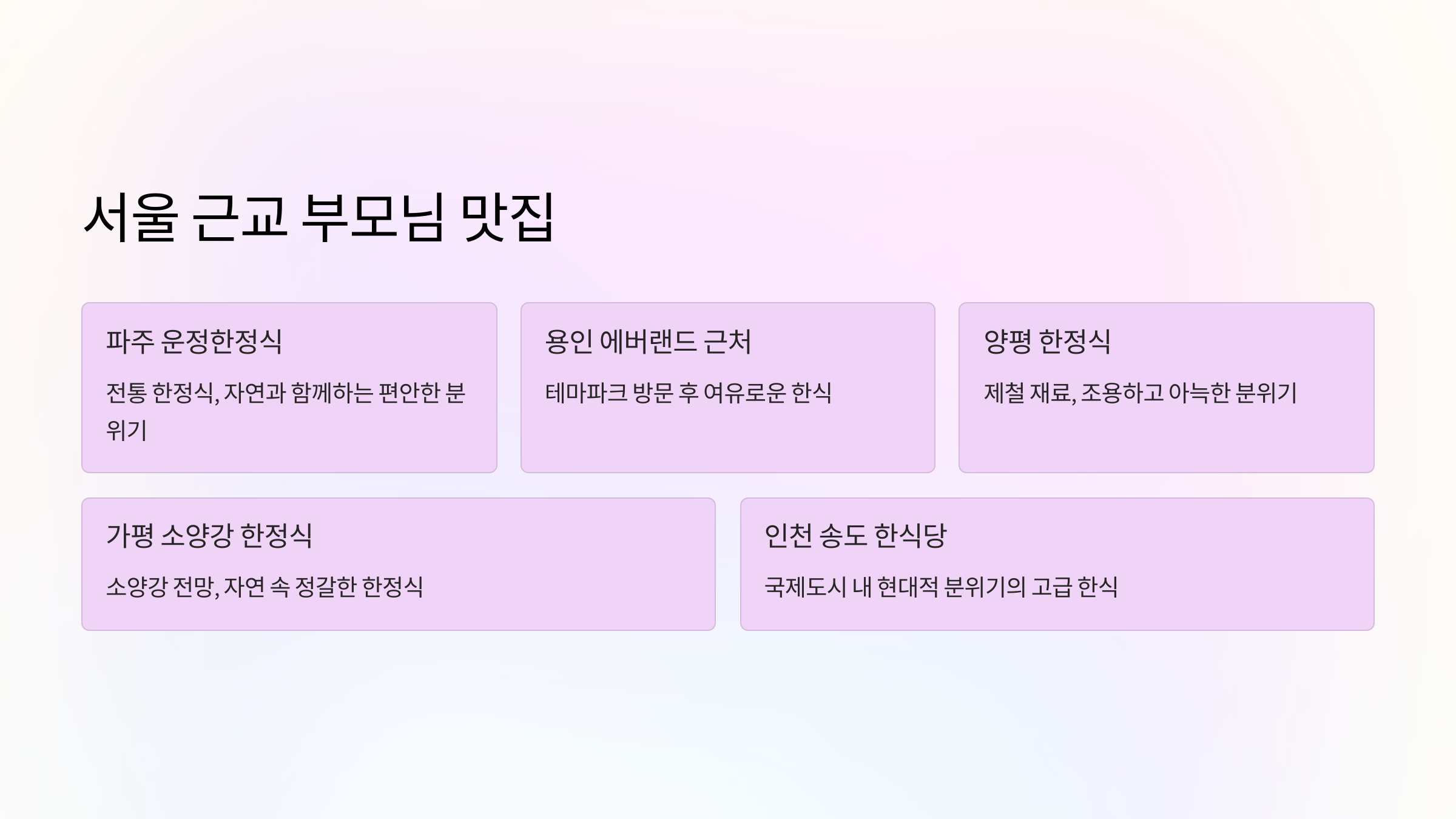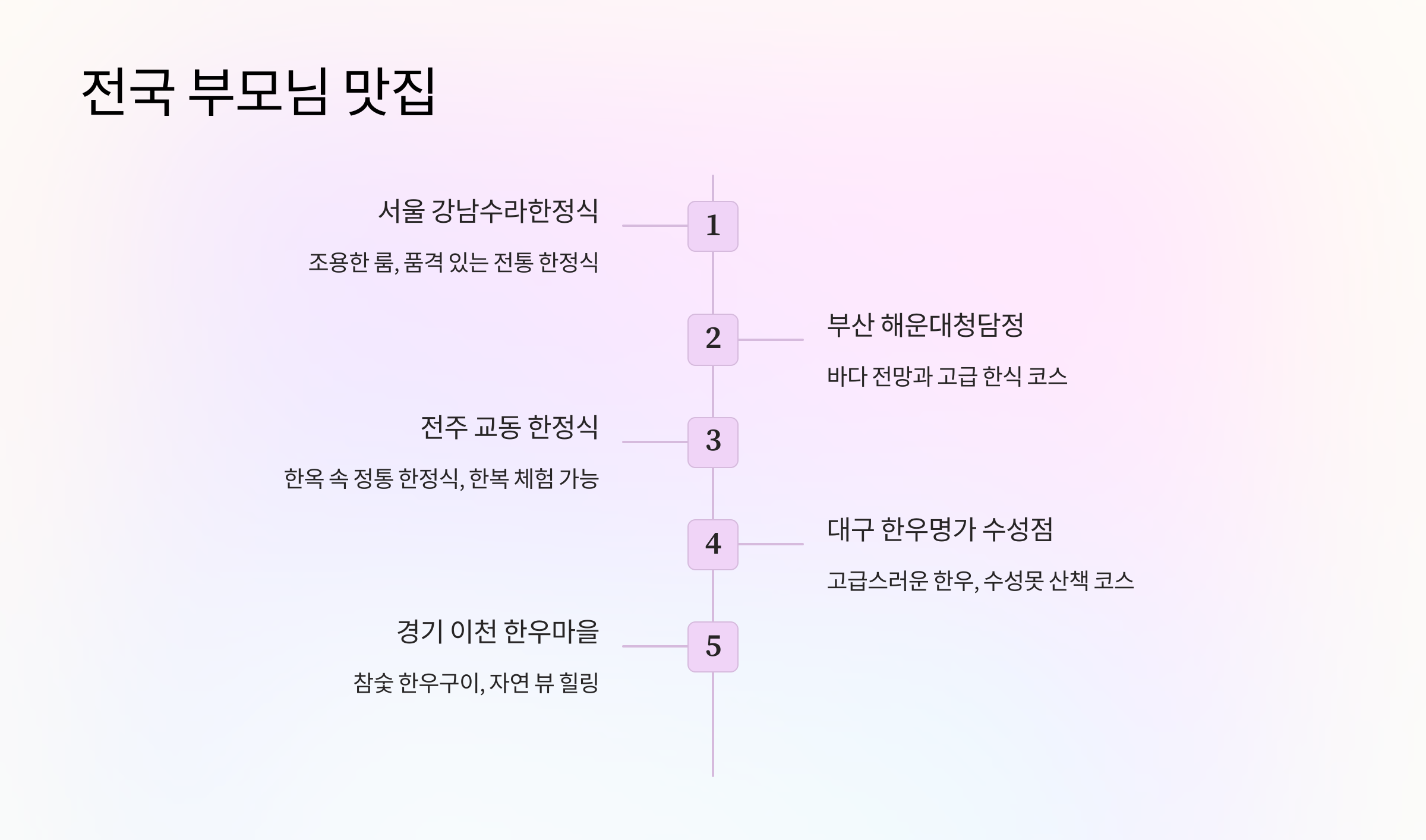 오늘은 부모님이 좋아하실 만한 분위기 좋고 맛도 훌륭한 식사 장소 5곳을 소개해드릴게요.