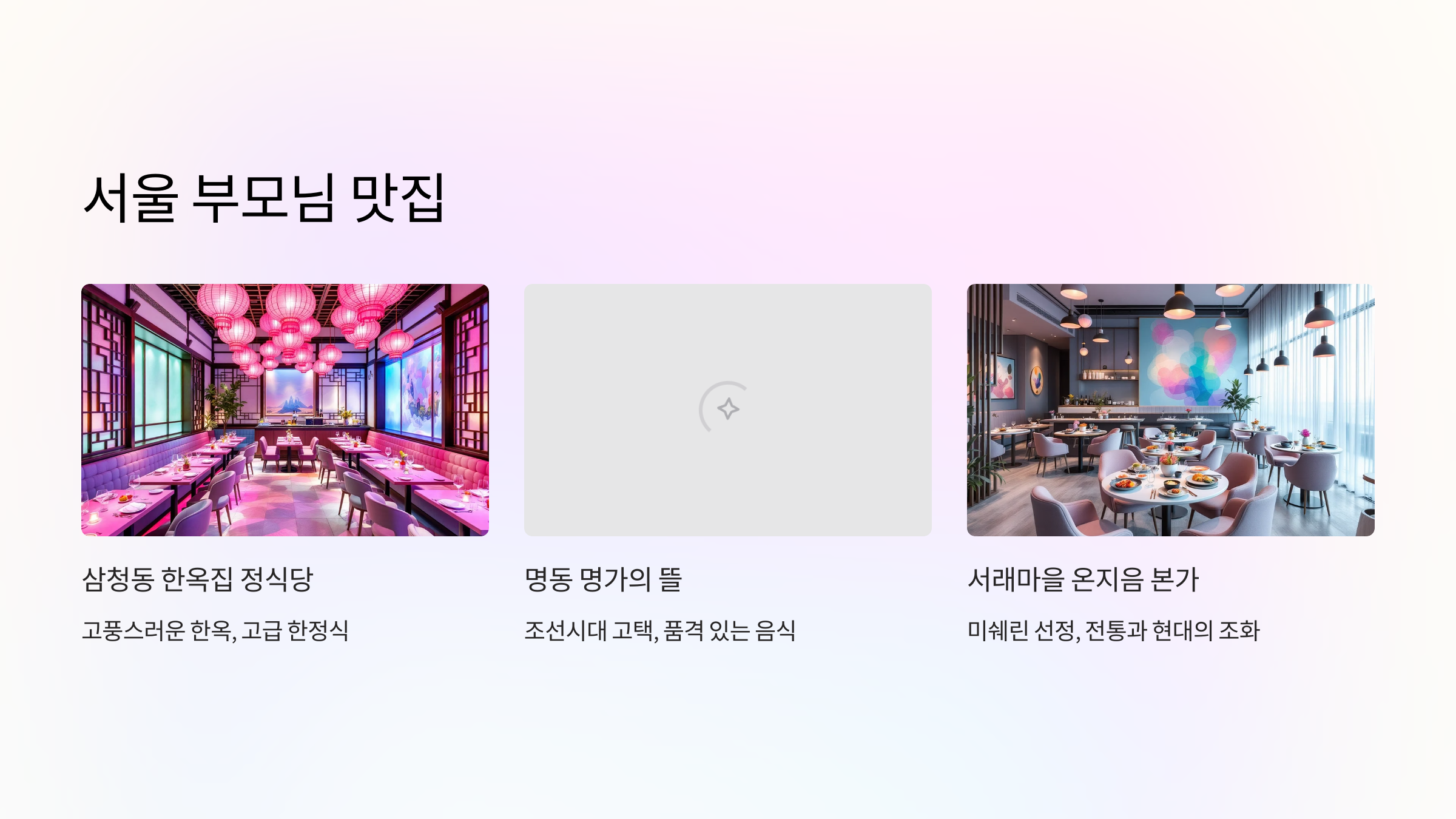 | 삼청동 | 한옥집 정식당 | 고풍스러운 한옥에서 전통의 멋과 고급 한정식을 즐길 수 있어요. |