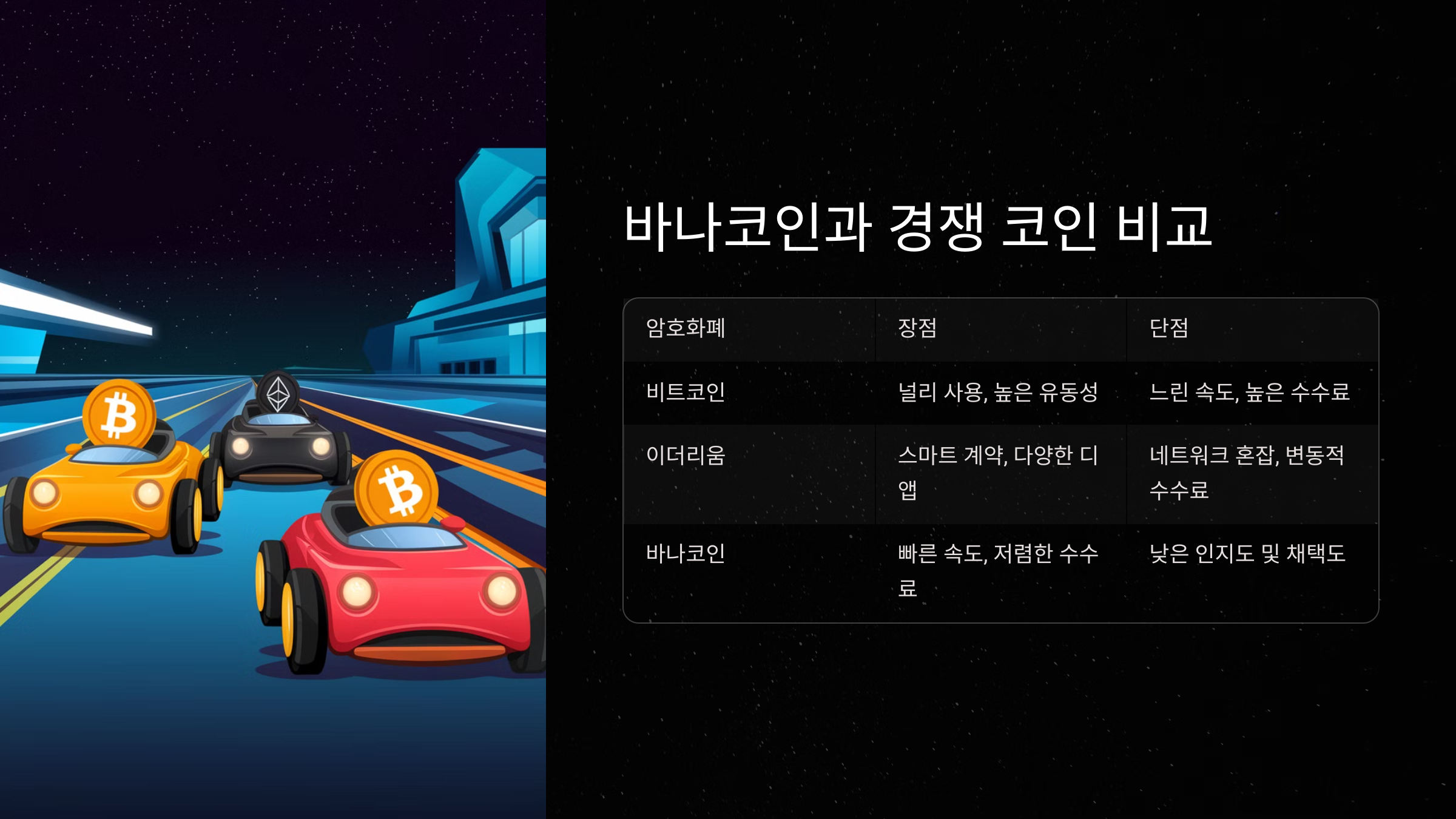| 바나코인 | 빠른 거래 속도, 저렴한 수수료, 커뮤니티 기반 | 아직 상대적으로 낮은 인지도 및 채택도 |