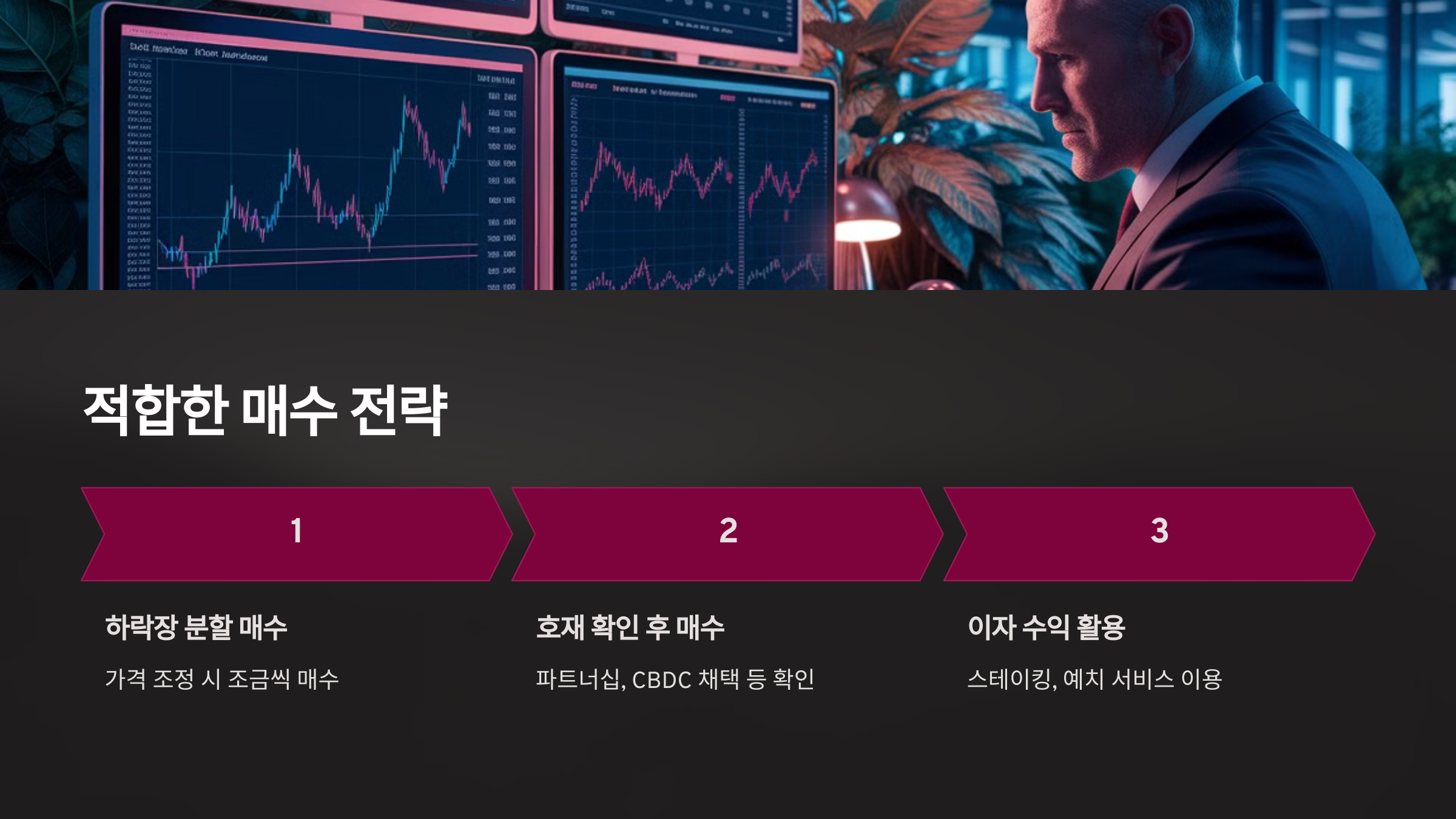 ✔ 장기적 호재(파트너십, CBDC 채택 등) 확인 후 매수