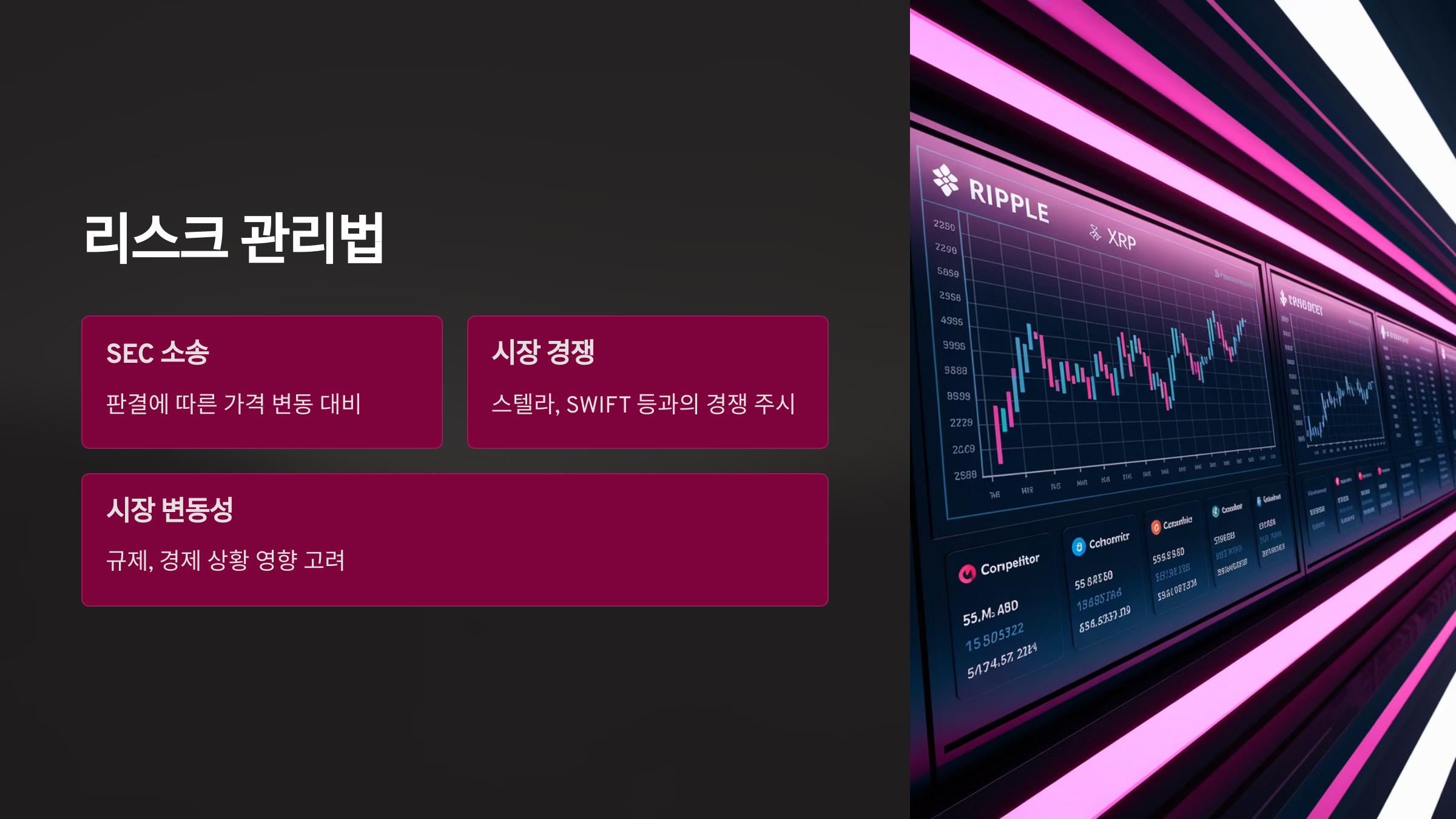 ⚠ 시장 경쟁 심화 – 스텔라(XLM), SWIFT 등과의 경쟁에서 리플이 얼마나 성과를 낼지 주목 필요