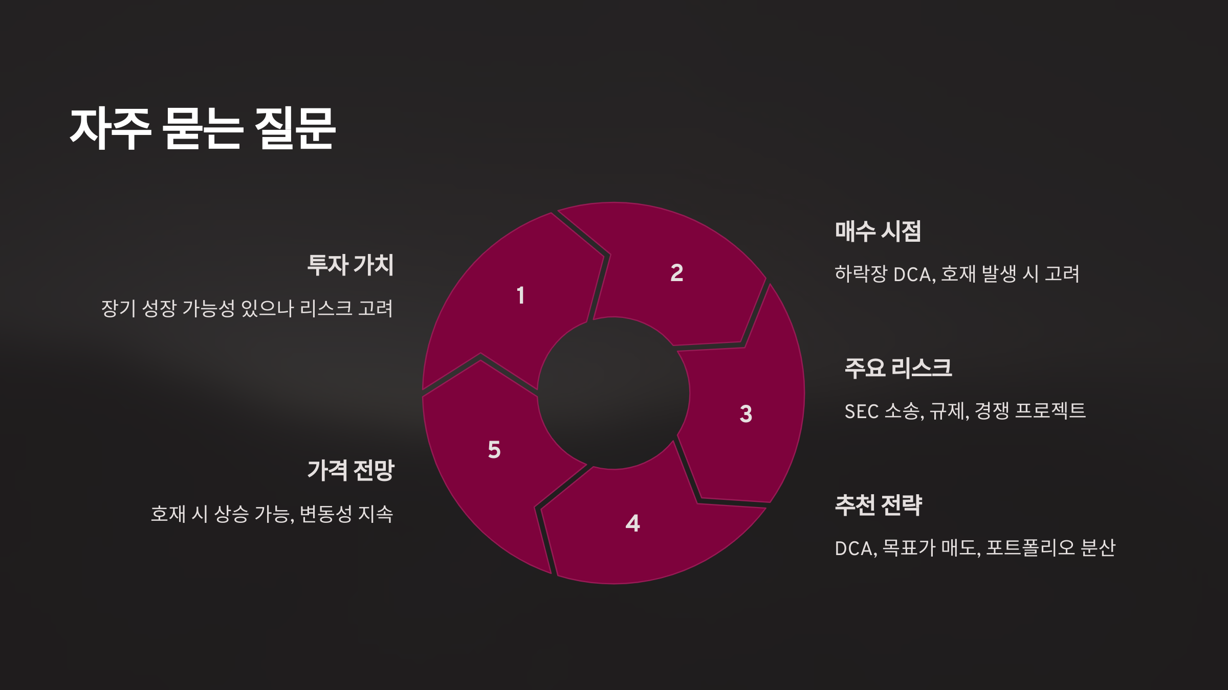 ✅ 리플의 주요 리스크는 SEC 소송 결과, 암호화폐 규제 변화, 경쟁 프로젝트(XLM, SWIFT 등)와의 경쟁입니다. 또한 암호화폐 시장 전반의 변동성이 크기 때문에 장기 보유 시 시장 상황을 지속적으로 점검해야 합니다.