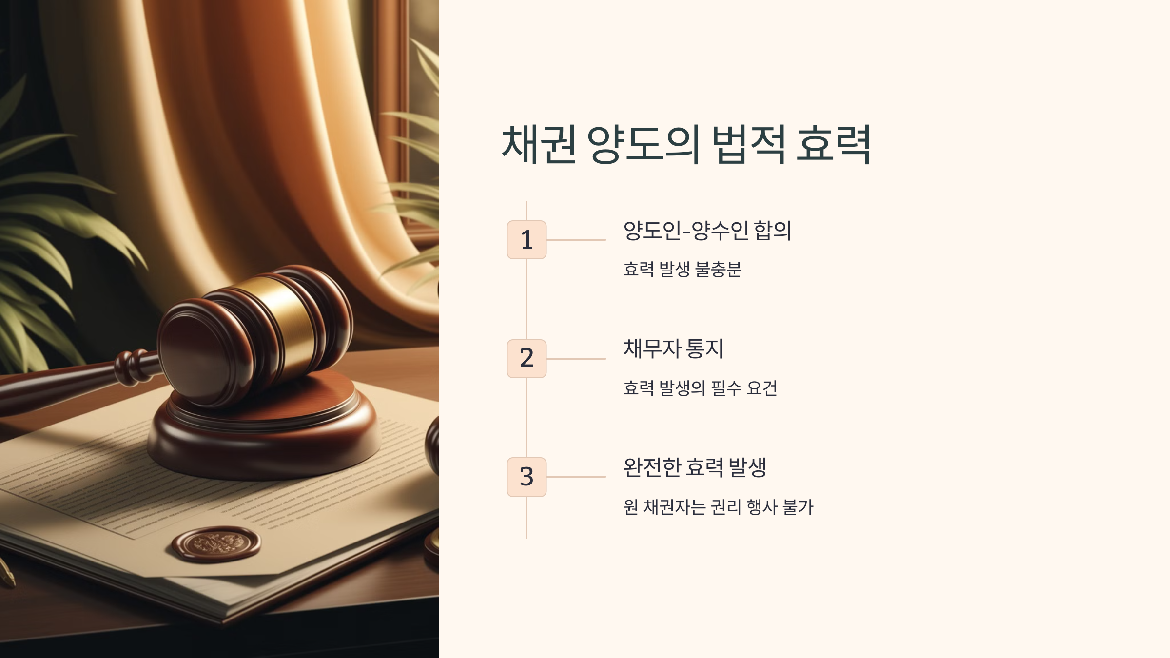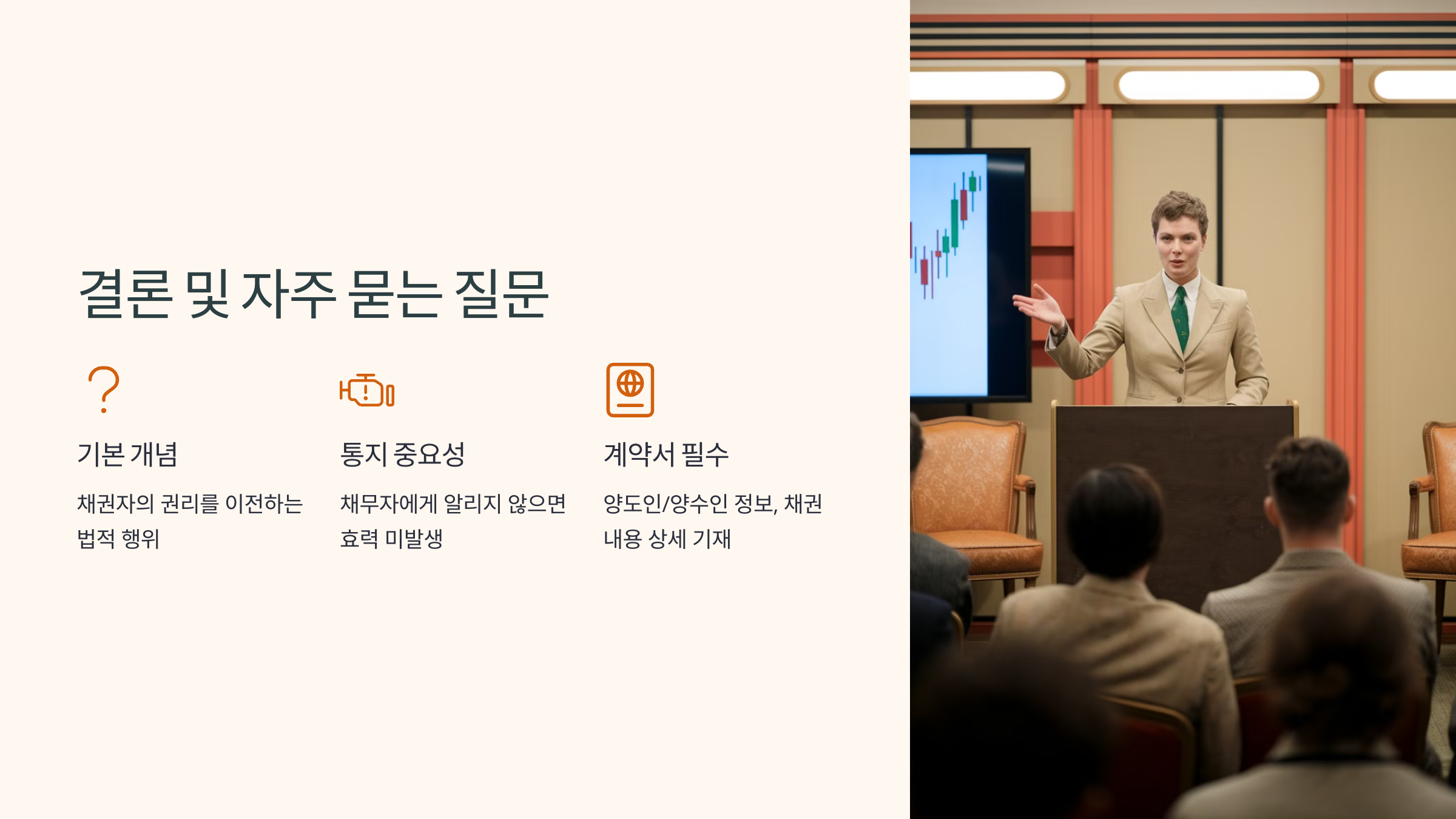 - 법적 효력 발생: 양도 계약이 체결되고, 채무자에게 통지되면 채권 양도의 법적 효력이 발생합니다.