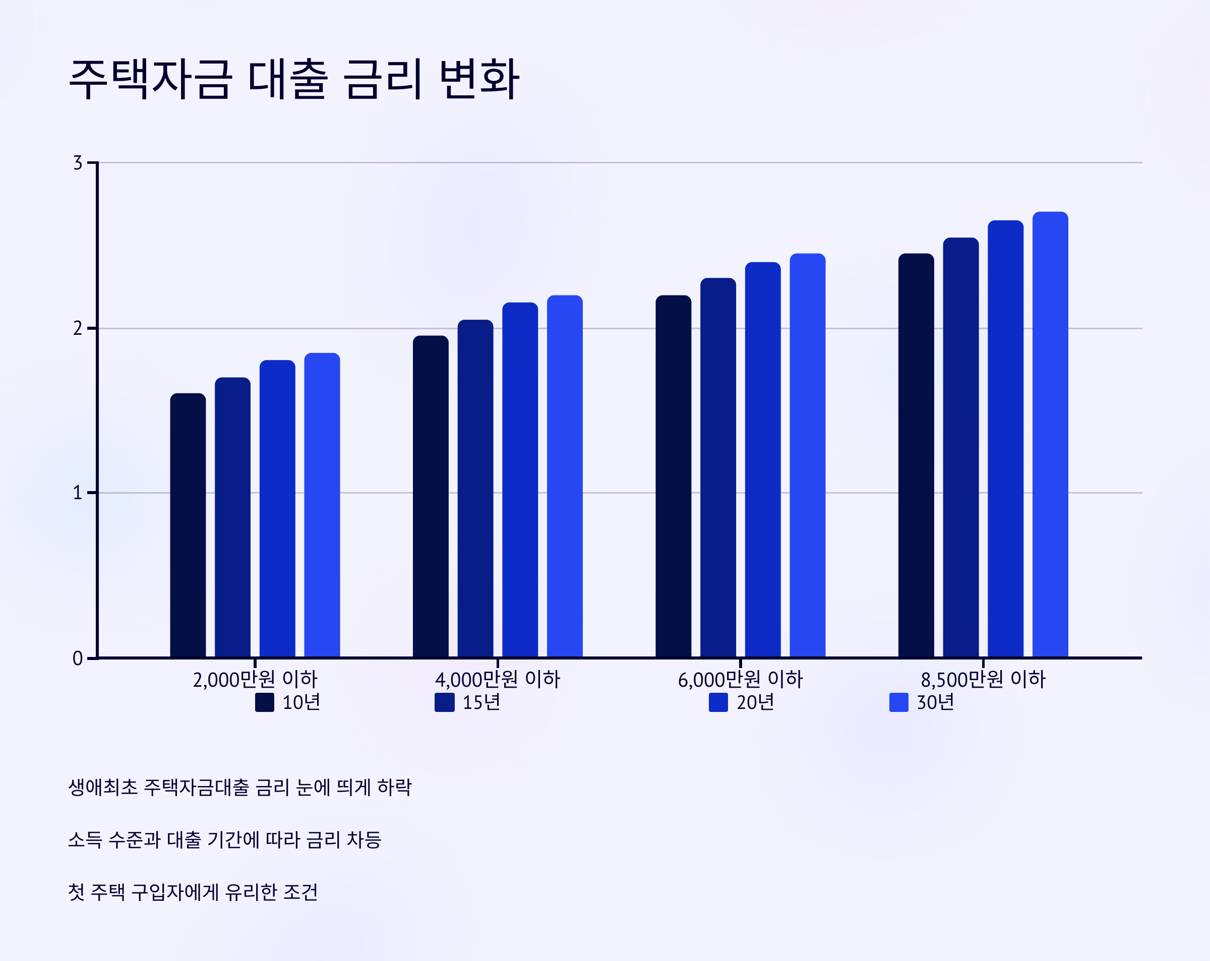 | 3. 생애최초 주택자금대출을 받을 수 있는 조건은? | 생애최초 주택자금대출은 소득 수준과 대출 기간에 따라 금리가 달라지며, 소득이 일정 기준 이하일 경우 저금리로 대출을 받을 수 있습니다. 자세한 조건은 각 금융기관에서 확인할 수 있습니다. |