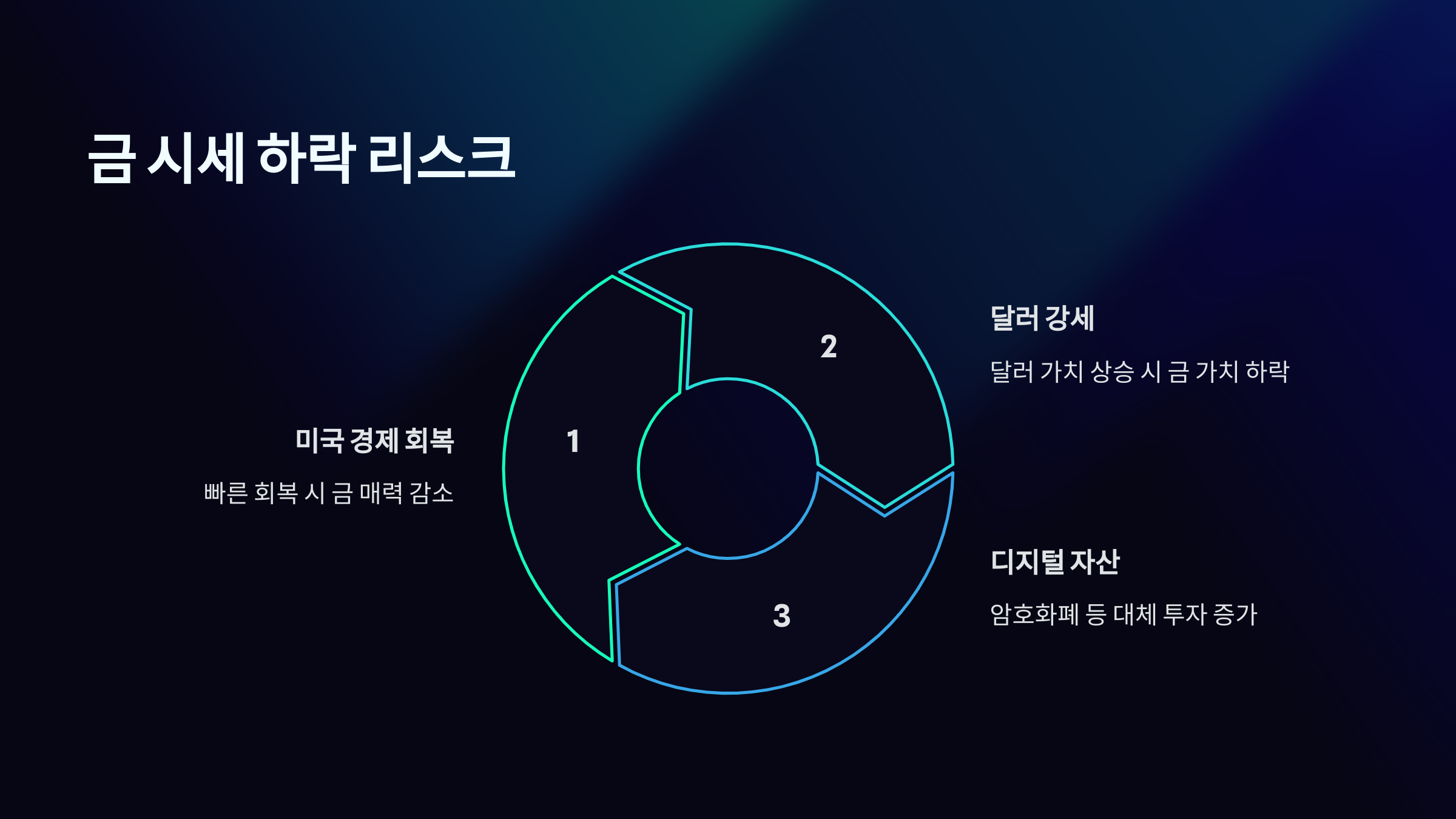 미국 경제 회복, 달러 강세, 그리고 디지털 자산의 인기가 금 시세 하락의 리스크 요소로 작용할 수 있습니다.