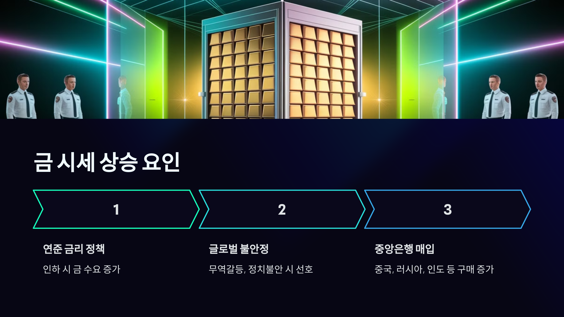 주요 요인은 금리 인하, 경제 불확실성, 그리고 중앙은행의 금 매입입니다. 이들 요인은 금을 안전자산으로 만드는 요소로 작용합니다.
