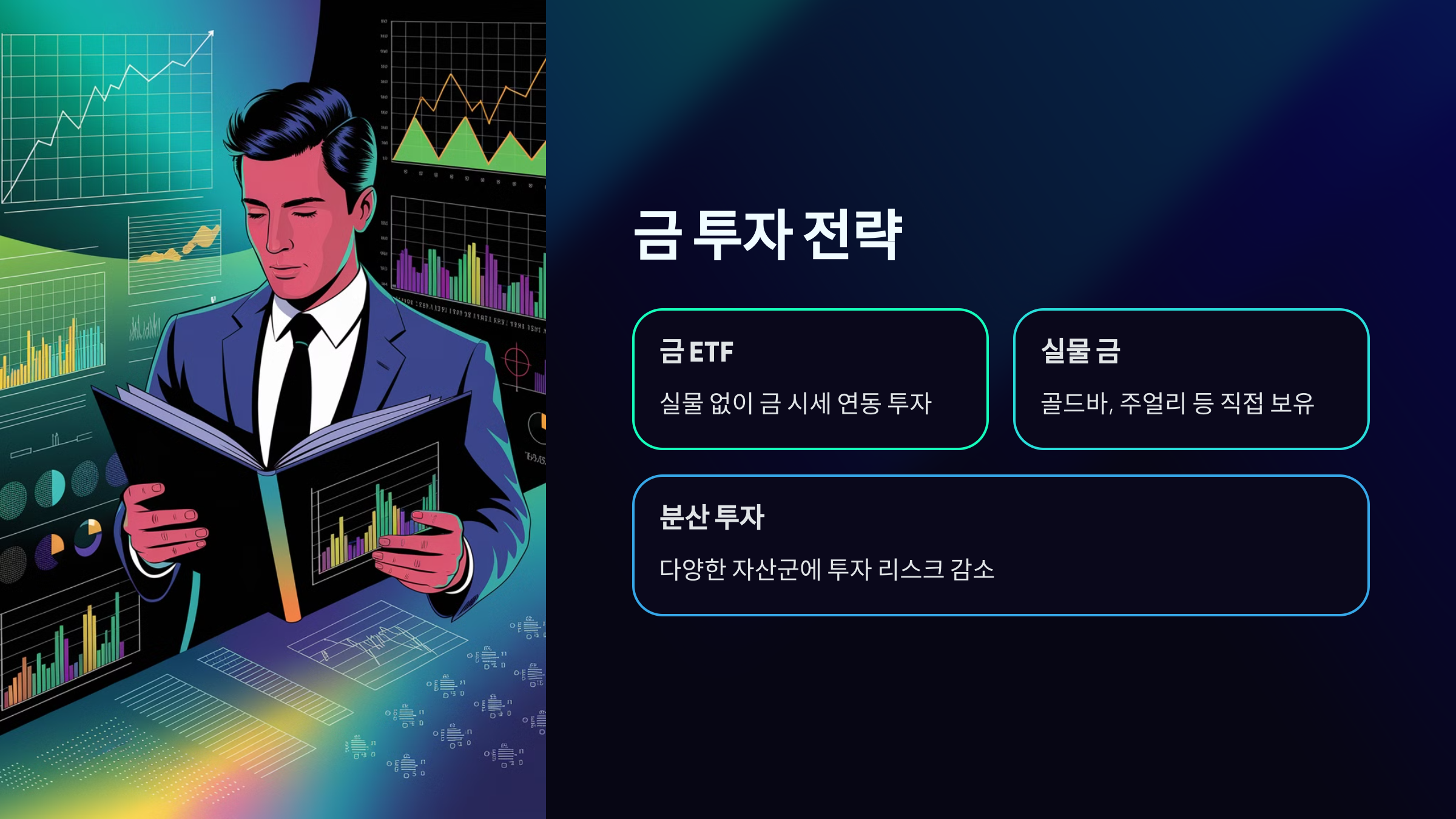 금 ETF, 실물 금 투자, 분산 투자가 주요 전략입니다. 다양한 자산에 분산 투자하여 리스크를 줄이고, 금 시세 상승을 활용할 수 있습니다