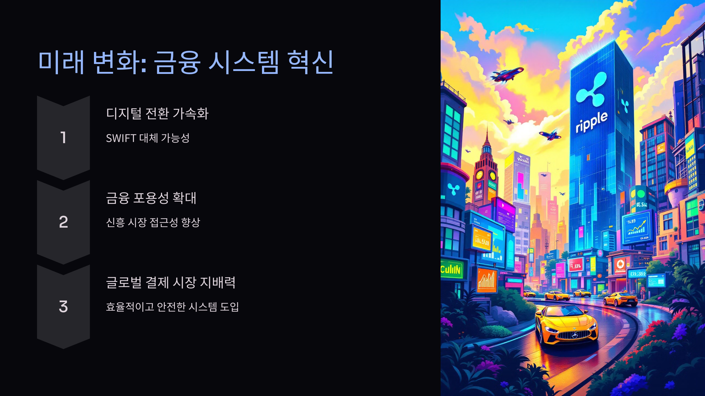 - 리플의 기술은 국제 송금의 표준을 재정의하며, 기존 SWIFT와 같은 전통 금융 시스템을 대체하거나 보완할 가능성이 있습니다.