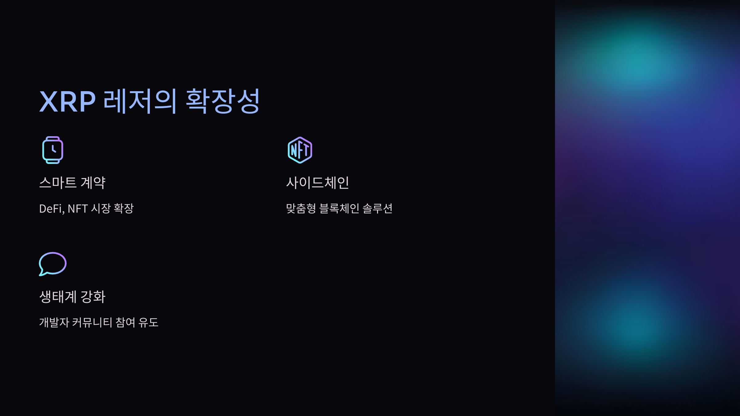 - XRP 레저는 스마트 계약 기능을 확장하여, 탈중앙화 금융(DeFi)와 NFT 시장 등 새로운 분야에서도 활용될 가능성을 열고 있습니다.
