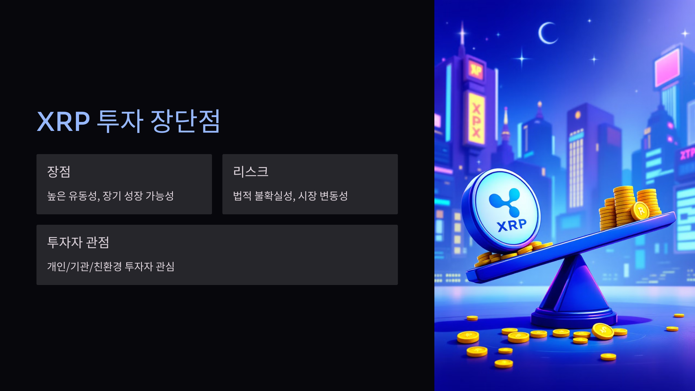 리플은 장기적 성장을 기대하는 투자자에게 적합합니다. 단, 암호화폐의 변동성과 규제 리스크를 감안하여 신중히 접근해야 합니다.