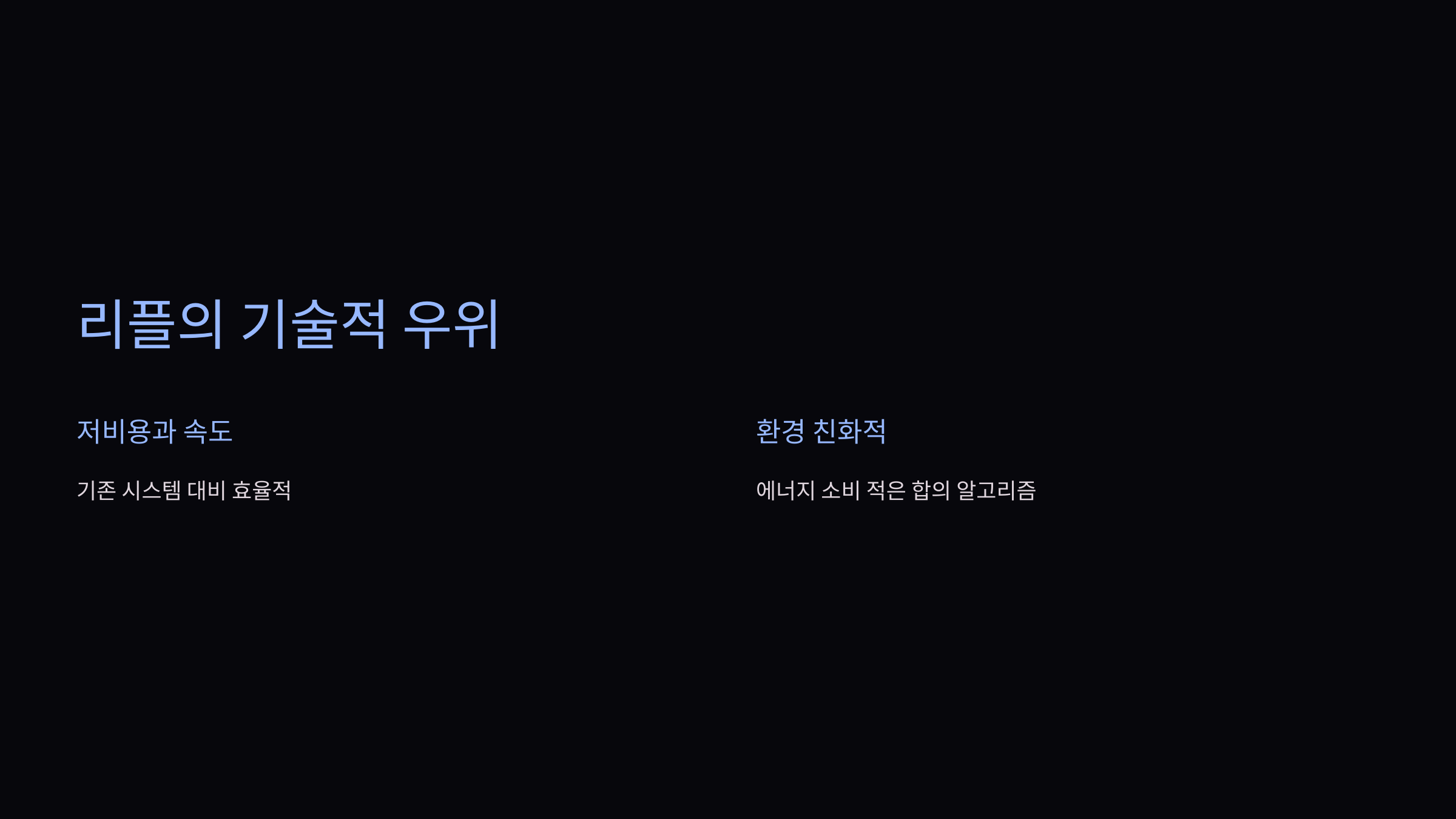 리플의 플랫폼은 기존 금융 시스템 및 다른 블록체인 네트워크와의 통합이 용이하여 글로벌 금융 생태계의 상호운용성을 높입니다. - 환경 친화성